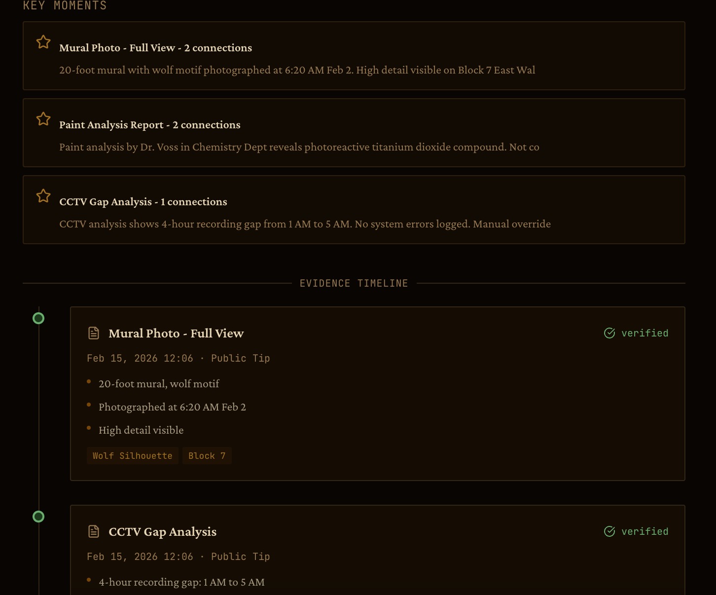 Students can submit tips in multiple formats — text, images or videos. Investigators then organize these reports on a drag-and-drop corkboard Case Wall, where each case becomes a visual entity. Inside a case, an interactive Evidence Board links media, notes and witness information into a connected network. This allows investigators to explore relationships between pieces of evidence and understand the narrative of an incident at a glance. Instead of scrolling through long lists, users interact with a living map of the investigation.