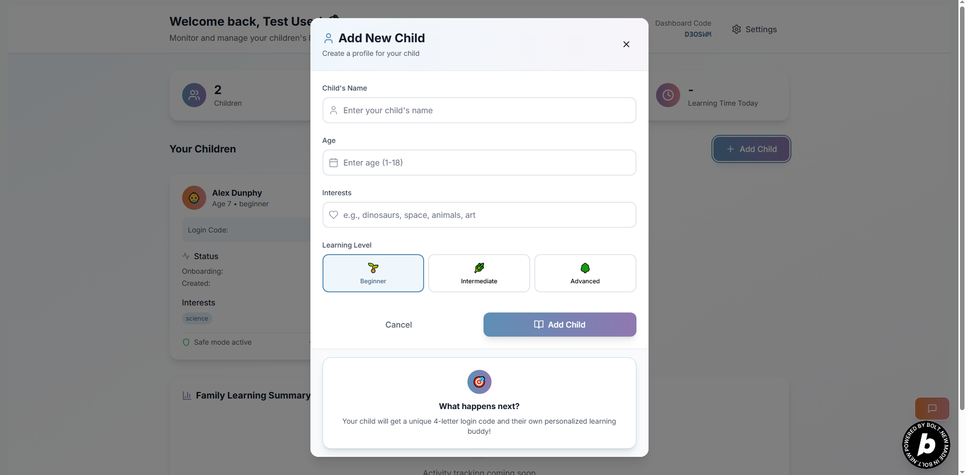 - Integrate adaptive learning logic to track and adjust based on child progress