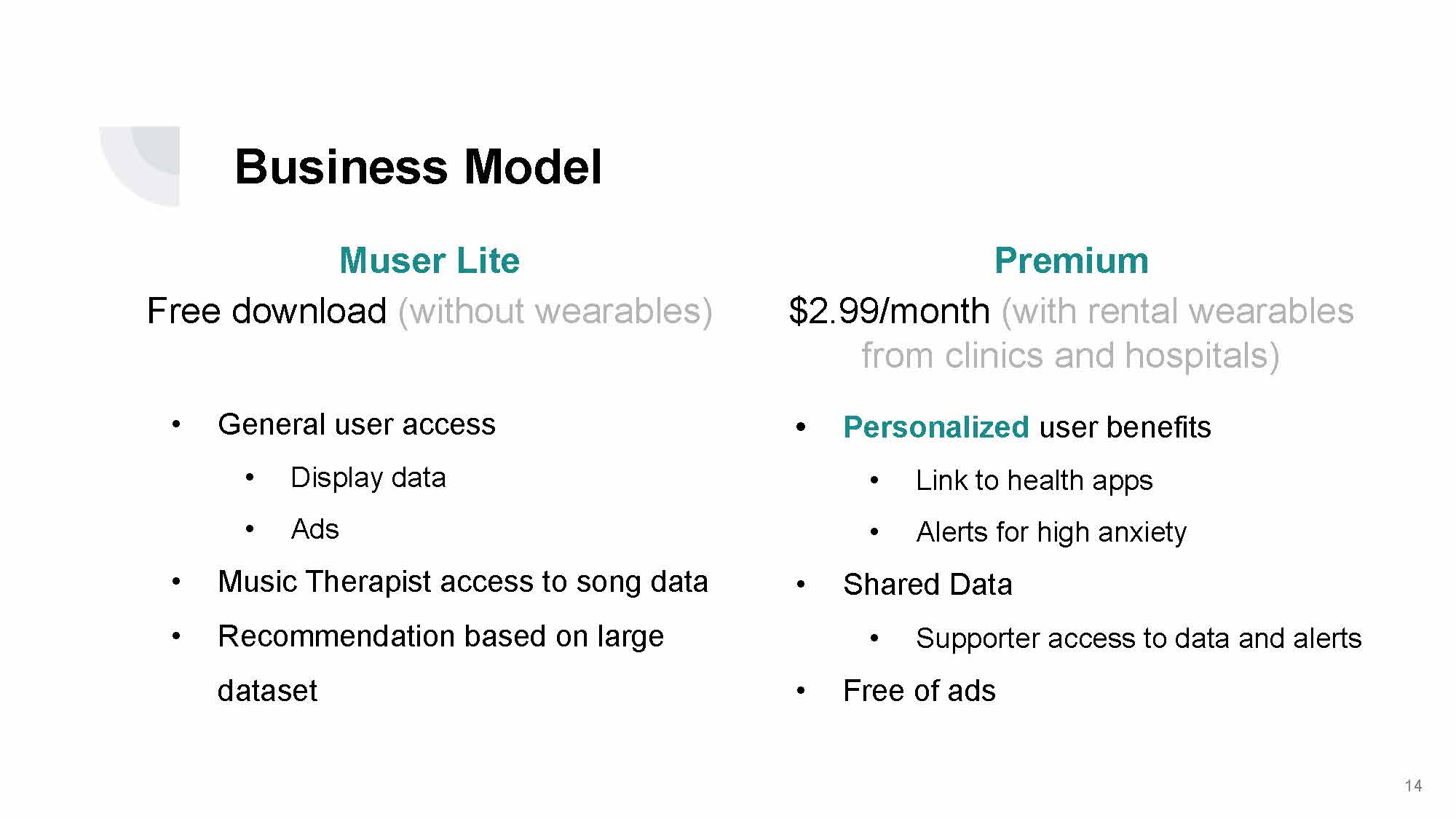 Muser collects biometric data from Biometric wearables can provide the biometric information, while large music streaming services provide a library of treatment. By combining the two assets, Muser aims at making music therapies quantifiable and reliable and curating a better mind-massage experience.