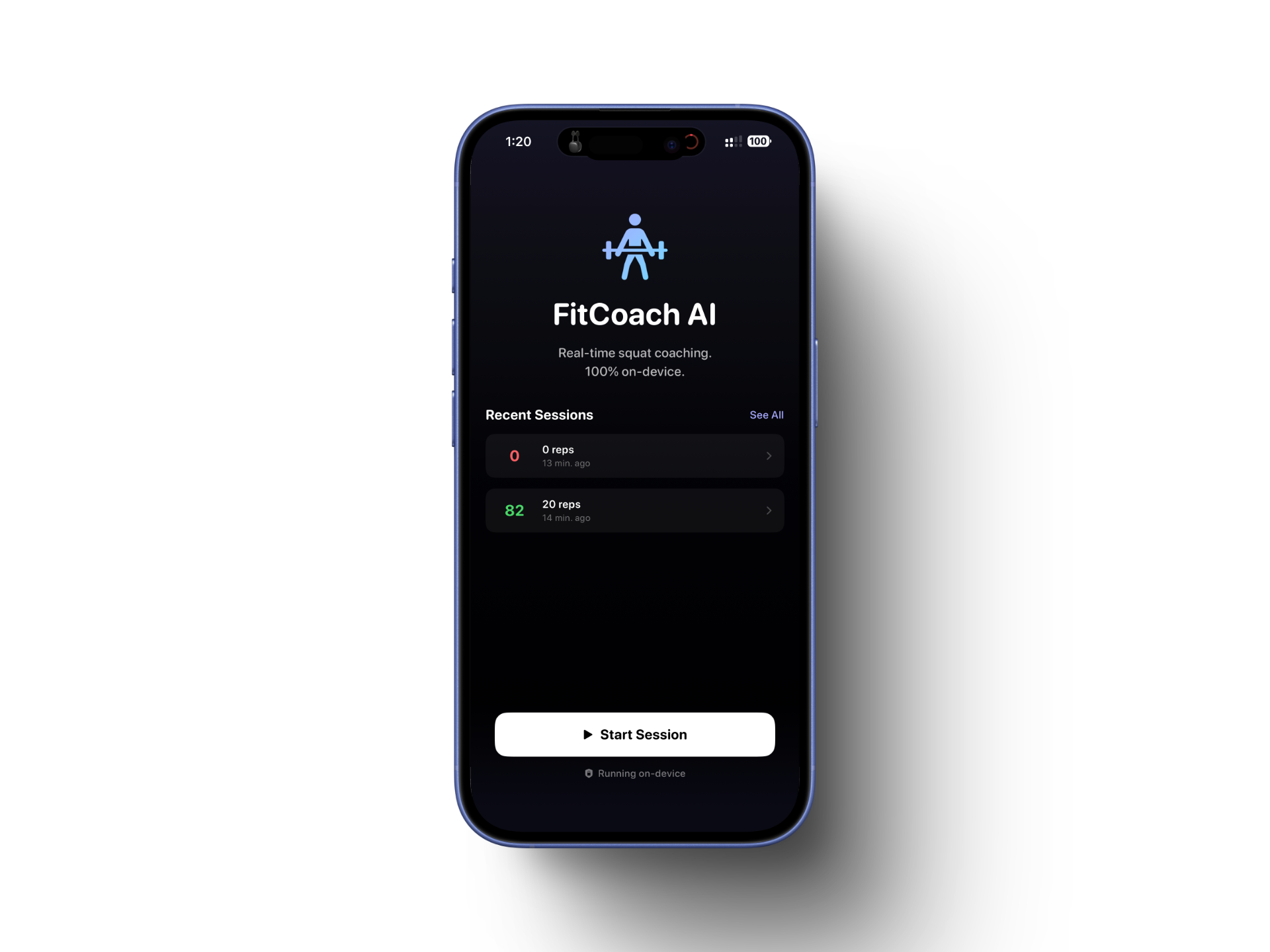 All inference runs on-device. No data is transmitted to any server during a workout session. Session history is stored locally on the device. The "Running on-device" badge is displayed on both the home and summary screens.