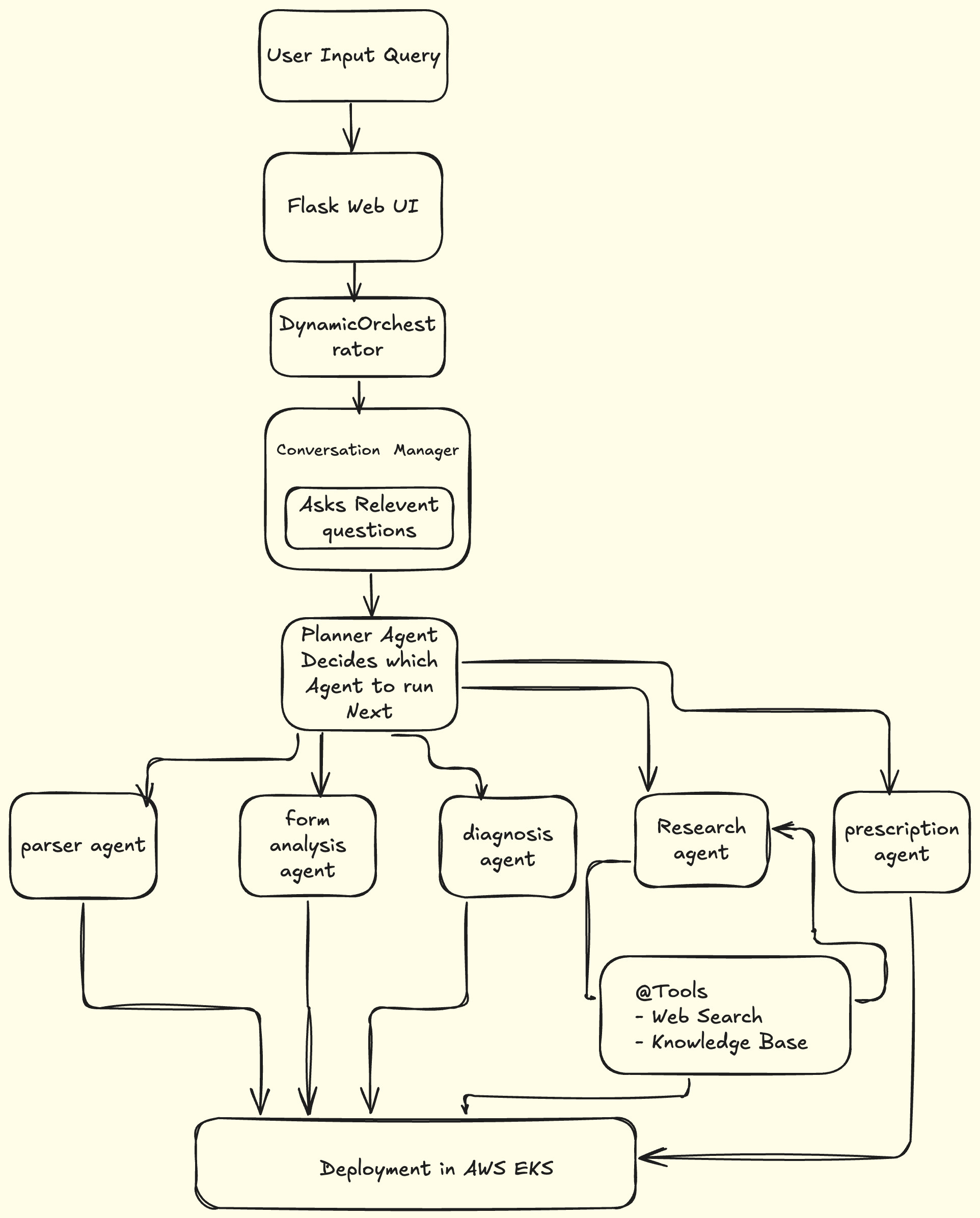 Crucially, Dynamic Orchestrator agent acts like the conductor of this orchestra – it doesn't always run every single agent blindly. It looks at the user's query and can skip certain steps if they're not needed, making the whole process more efficient. (In early prototypes, the pipeline was fixed and always ran all agents, which was overkill for simple questions.) built in a safety net for unclear queries: a Conversation Manager agent. If the user's input is ambiguous or lacking details, this agent will politely ask clarifying questions (just like a real doctor might say "Wait, can you show me exactly where it hurts?"). This addition made the system feel much more interactive and realistic during testing.