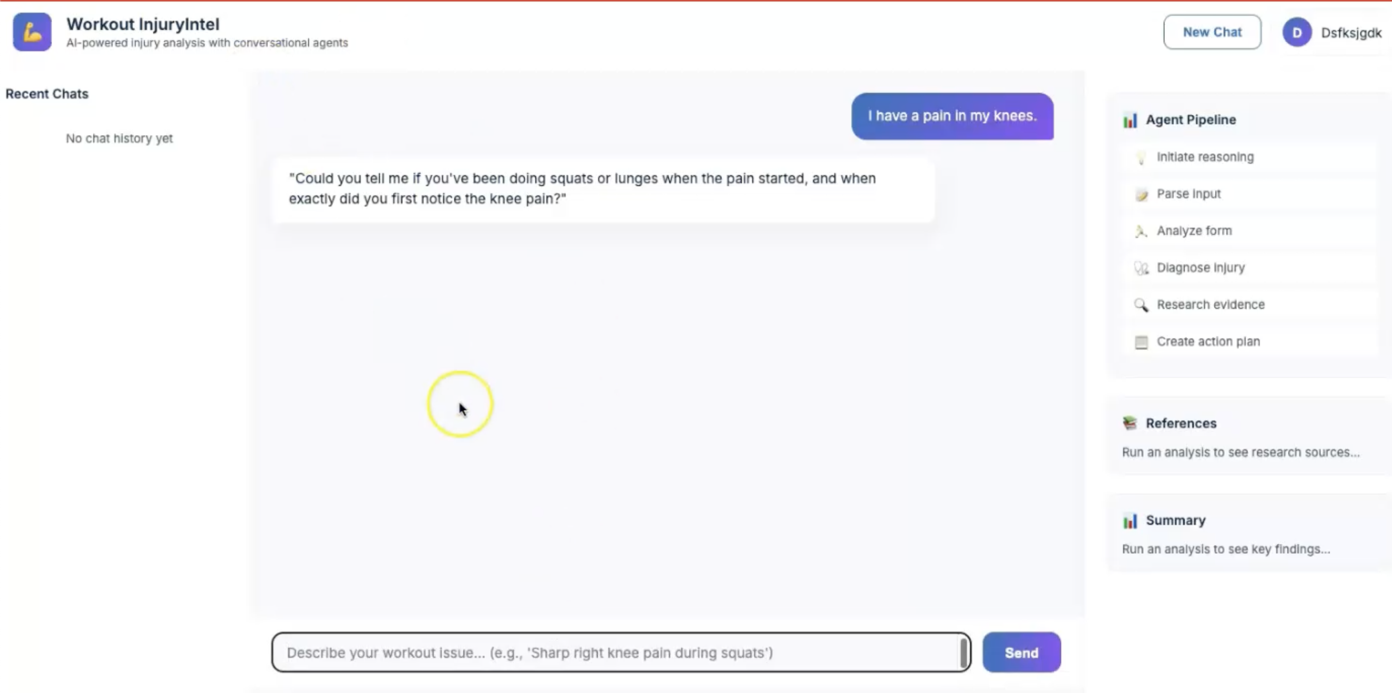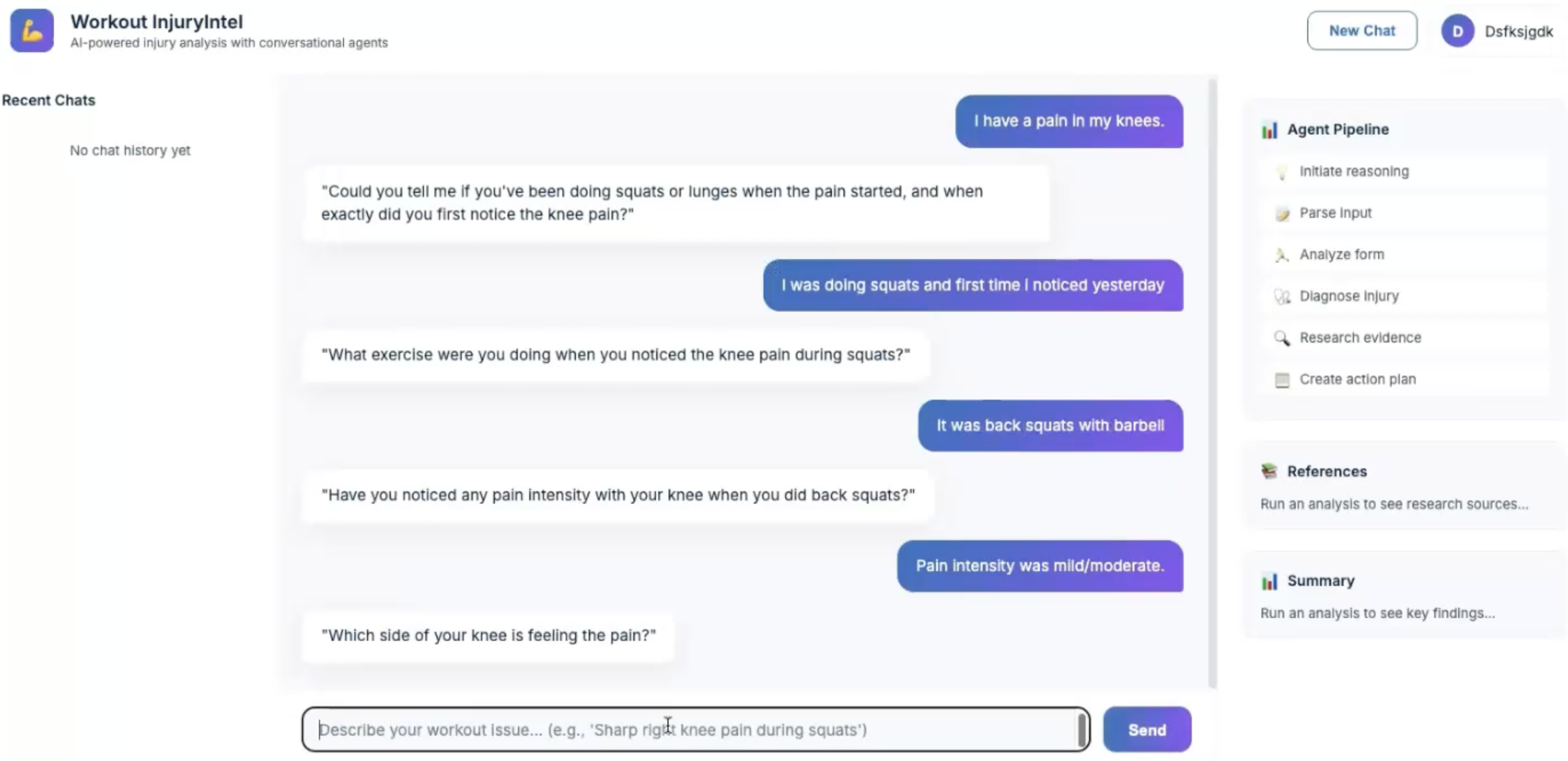 I'm proud to have built a system that doesn't just talk like an AI — it reasons like a human expert. Workout InjuryIntel can take a plain-English description like "I feel a sharp pain in my right knee after squats" and turn it into a structured, evidence-backed diagnosis with a personalized recovery plan — all in seconds.