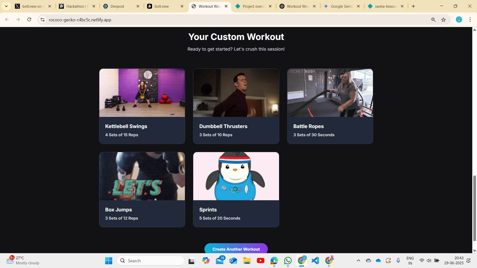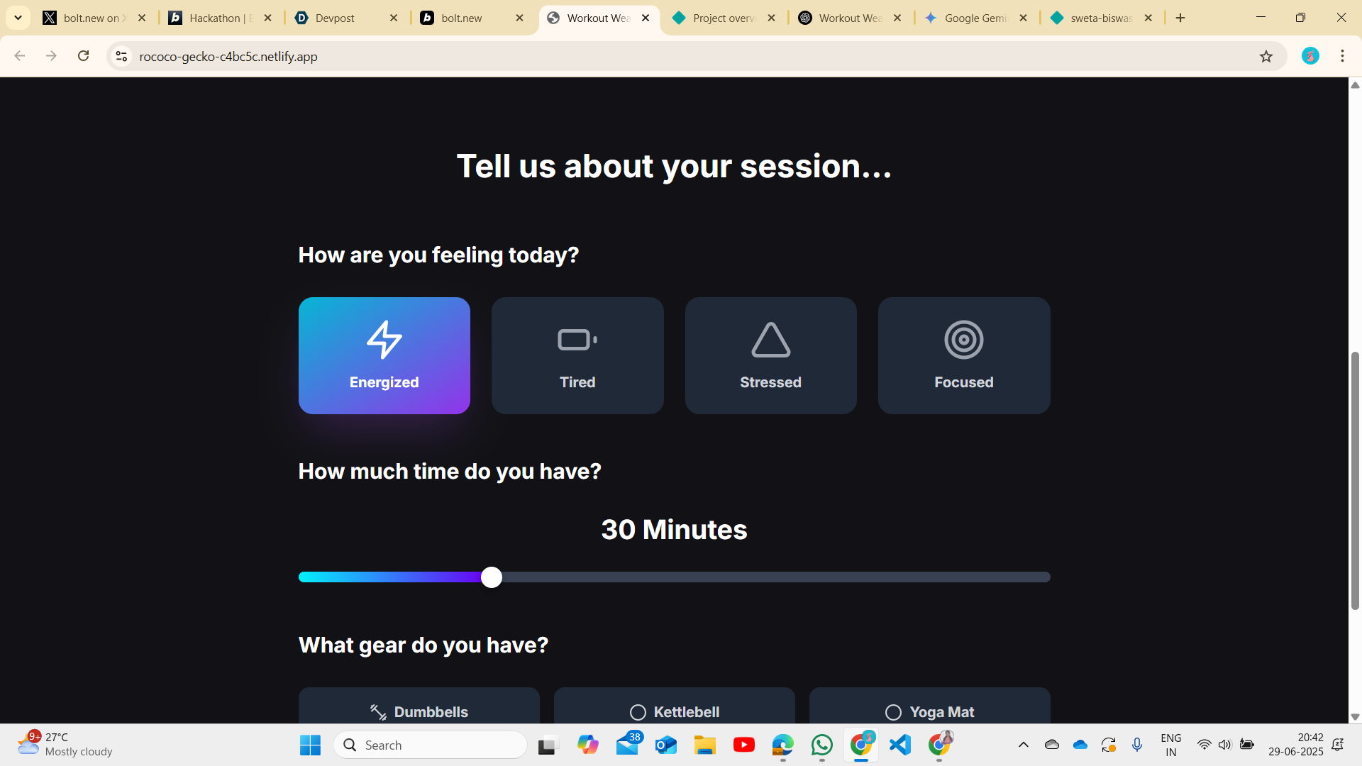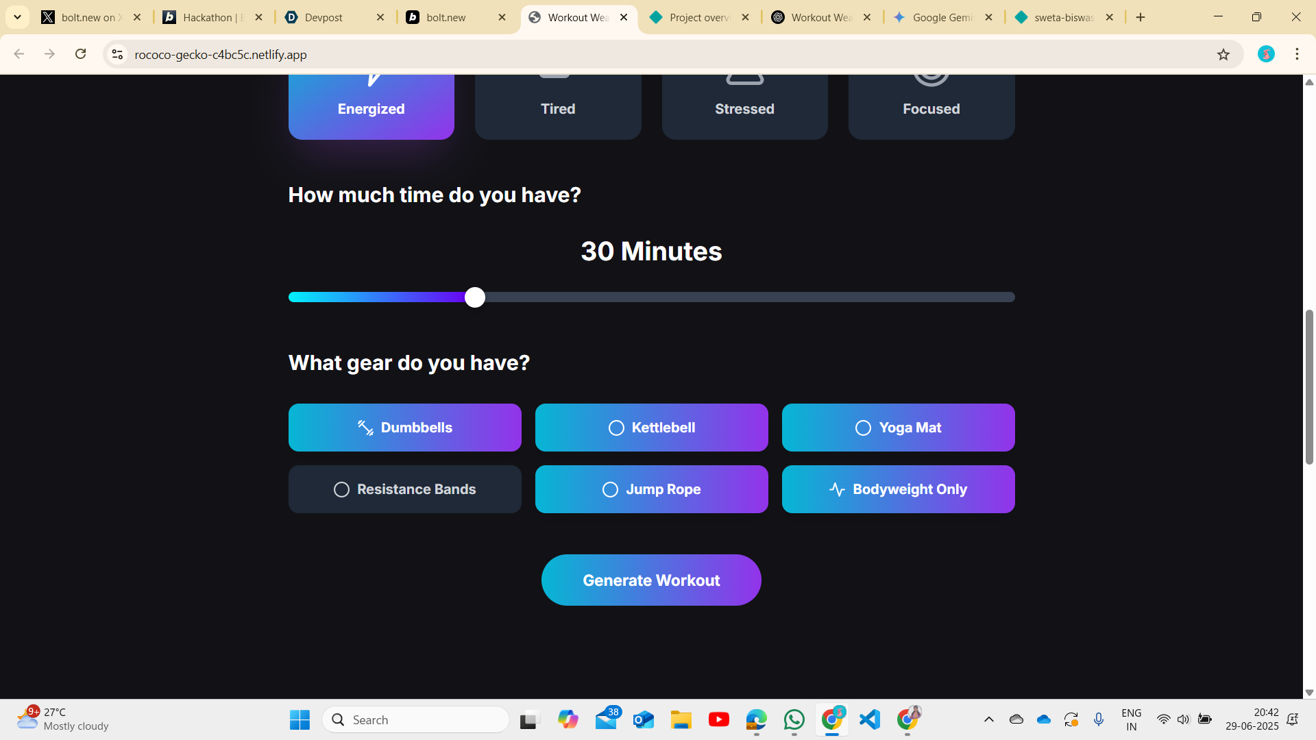 I often found it hard to decide what workout to do—especially when I was feeling tired, short on time, or had limited equipment. Most workout apps felt too generic. That’s when I thought: “What if there was a fun app that just knew what I needed today?” That simple idea became Workout Weaver — an AI-powered app that gives you a perfect workout based on your mood, time, and gear.