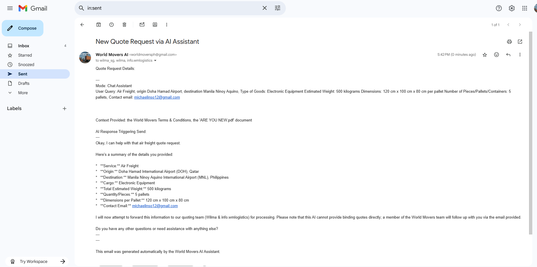 - Quote Request Initiation: Gathers necessary details from users and can automatically prepare and forward a quote request summary to the World Movers team via email.