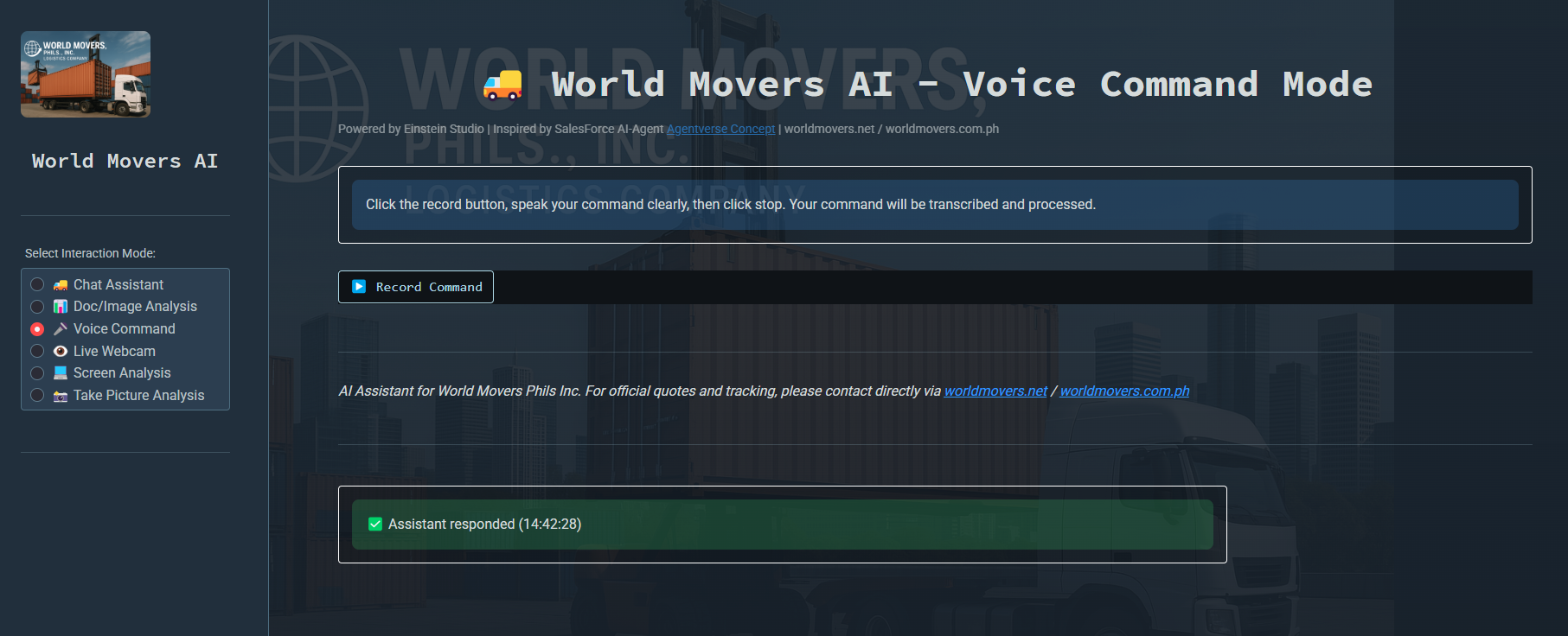 In today's fast-paced logistics industry, customers expect instant, accurate, and accessible support. We were inspired to create an AI-powered solution that could not only answer customer queries 24/7 but also empower the World Movers Phils Inc. team with advanced tools. The goal was to bridge the gap between traditional customer service and modern AI capabilities, offering a seamless, multimodal experience that enhances efficiency and customer satisfaction. We also saw an opportunity to integrate a responsible marketing tool, provide access to essential freight calculation utilities, offer basic estimation tools for conceptual understanding, visualize potential future drone operations, and keep stakeholders informed with a live industry news feed, all to help the business operate more effectively and innovatively.