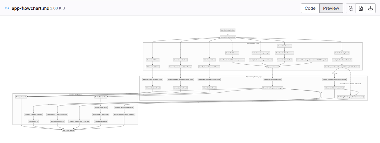 - Multimodal Context Aggregation ๐ง : Effectively combining diverse inputs (text, multiple file types, images, live feeds, internal knowledge documents) into a coherent context for the Gemini API required careful prompt engineering.