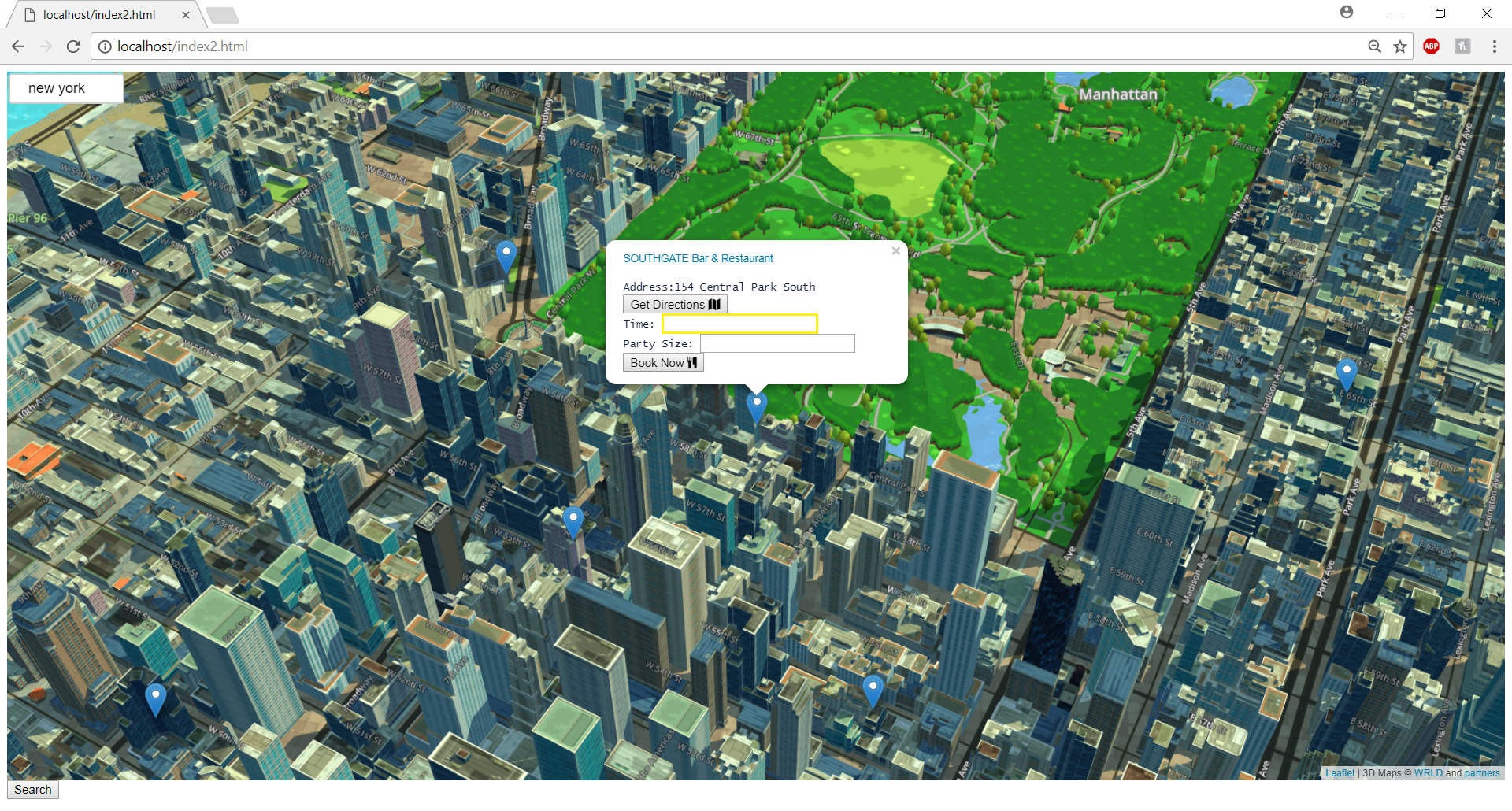 It searches for all of the restaurants in opentable's current API by a user inputted city. The restaurants will then be projected on top of Wrldz' 3-d rendering of the world. Users can click on restaurants to find where they are located and create reservations.