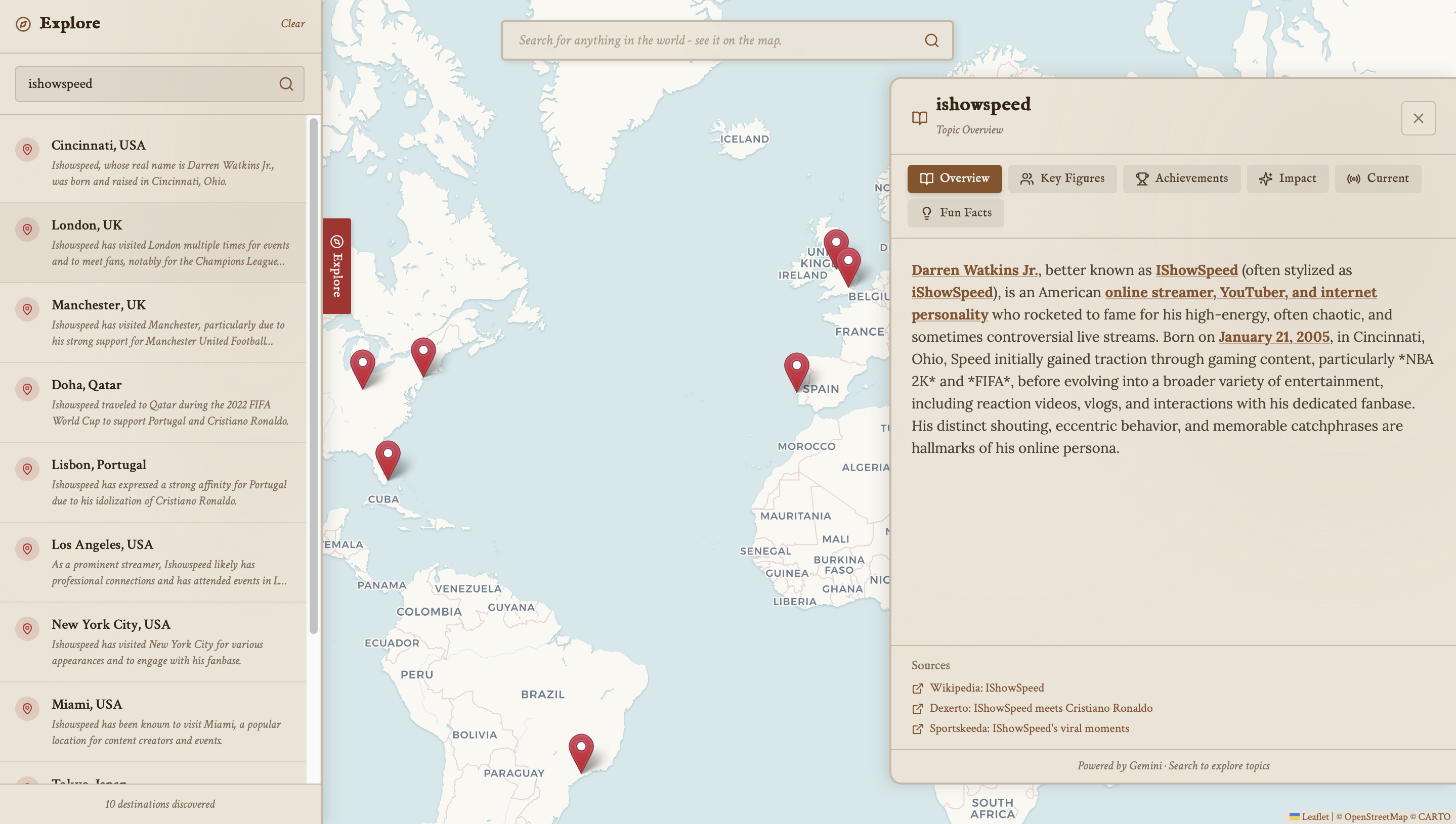 Explore and learn about the world through your own unique lens. Journey to anywhere on the map, or discover places associated with any topic you can dream of. The story of our world, visualized.