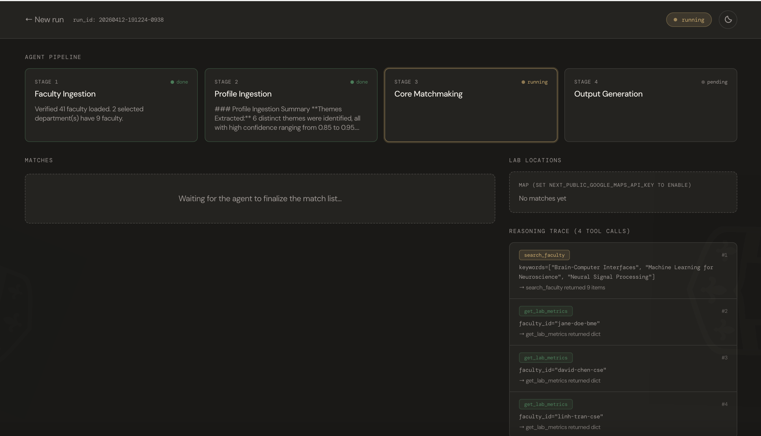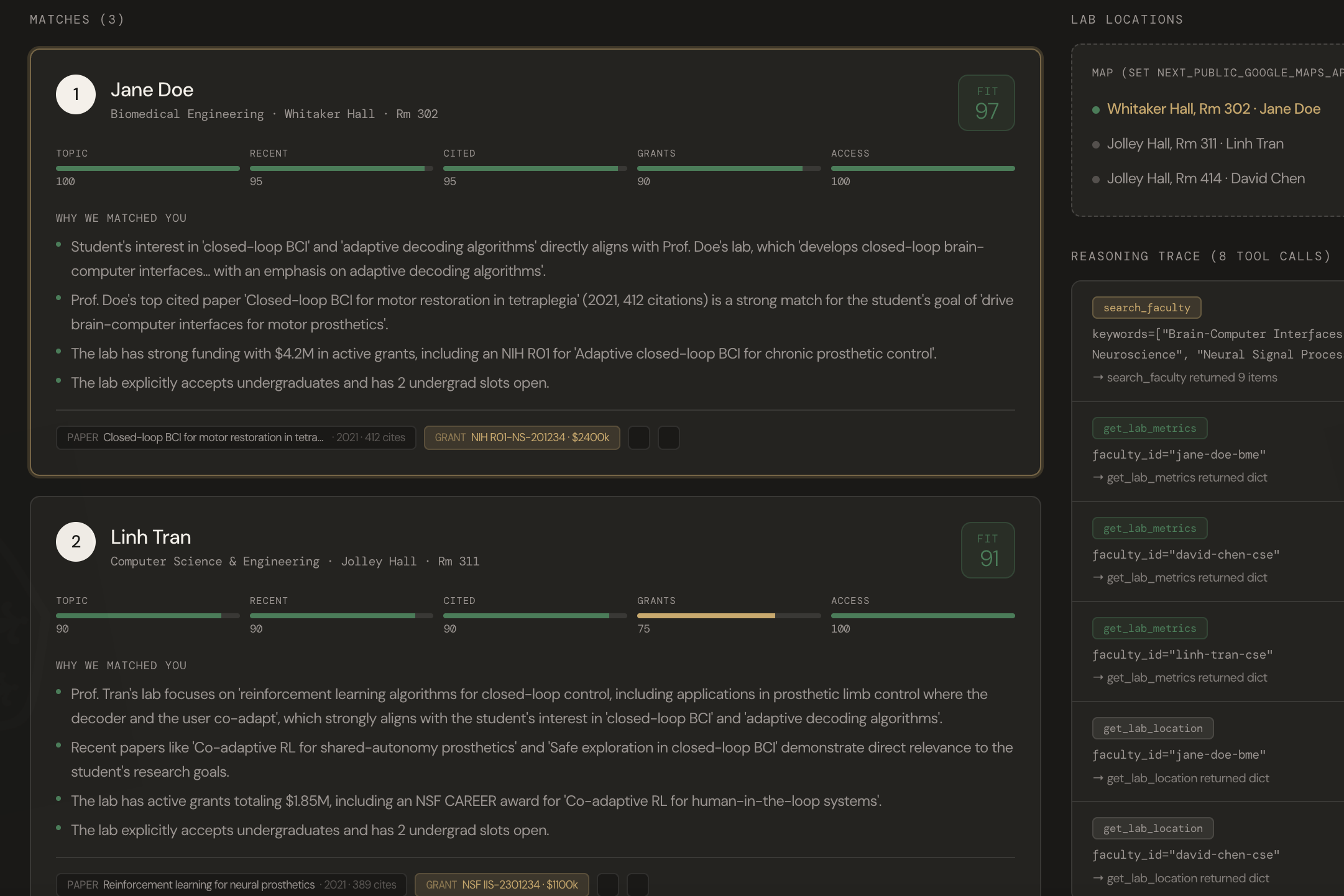 search_faculty,get_lab_metrics,get_lab_location) based on the student's unique profile. It evaluates semantic alignment between student interests and each faculty member's 5 most recent and 5 most cited papers, weighs active grant quality, and checks undergraduate openness. Every tool call is logged to Firestore and streamed to the UI's reasoning trace.Output Generation — Drafts a unique, non-generic cold email per match incorporating specific details from the reasoning trace, then writes the final bundle to Firestore.