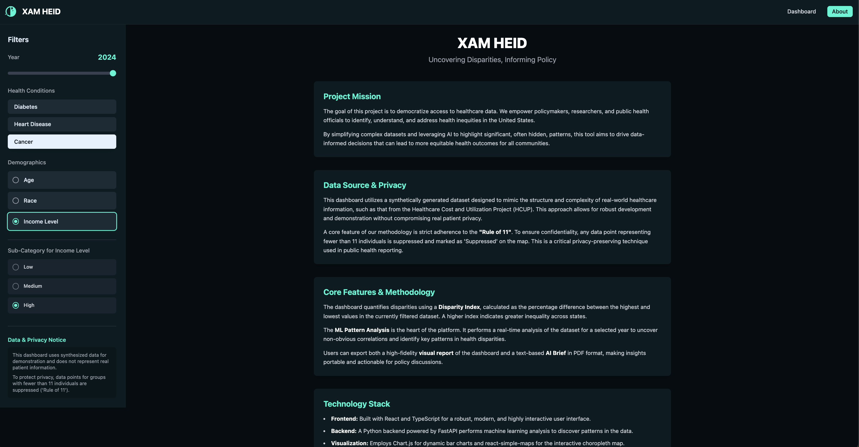 Health inequities often remain hidden within fragmented and complex datasets. Policymakers, researchers, and health planners face significant barriers accessing and analyzing data that reveal disparities in underserved populations. XAM-HEID was born from the need to democratize healthcare data access via AI-powered, privacy-first insights, empowering equitable healthcare decisions through accessible technology.