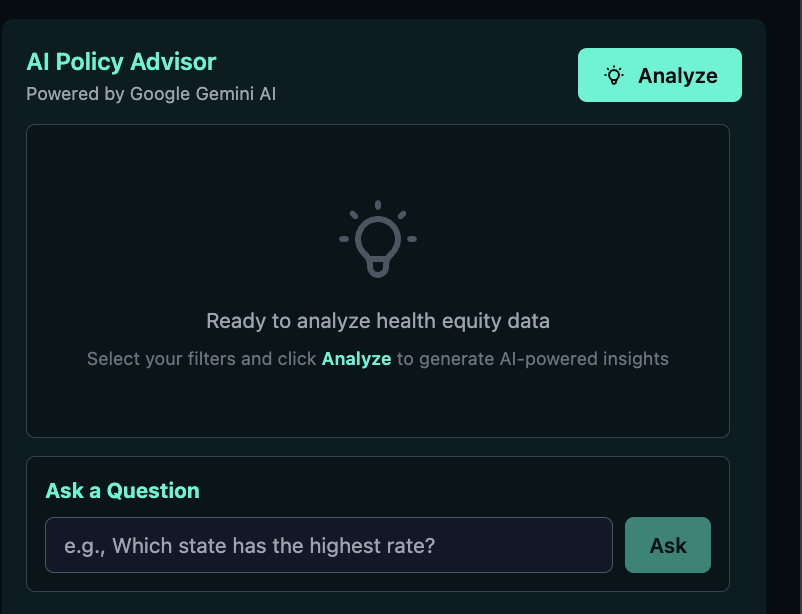 We delivered a production-ready platform that makes health disparity analysis accessible to non-technical users. Our system automatically enforces privacy regulations while delivering meaningful insights. The AI engine successfully identifies complex disparity patterns that would take researchers weeks to discover manually. Most importantly, we've created a tool that empowers real decision-making with exportable, policy-ready reports.
