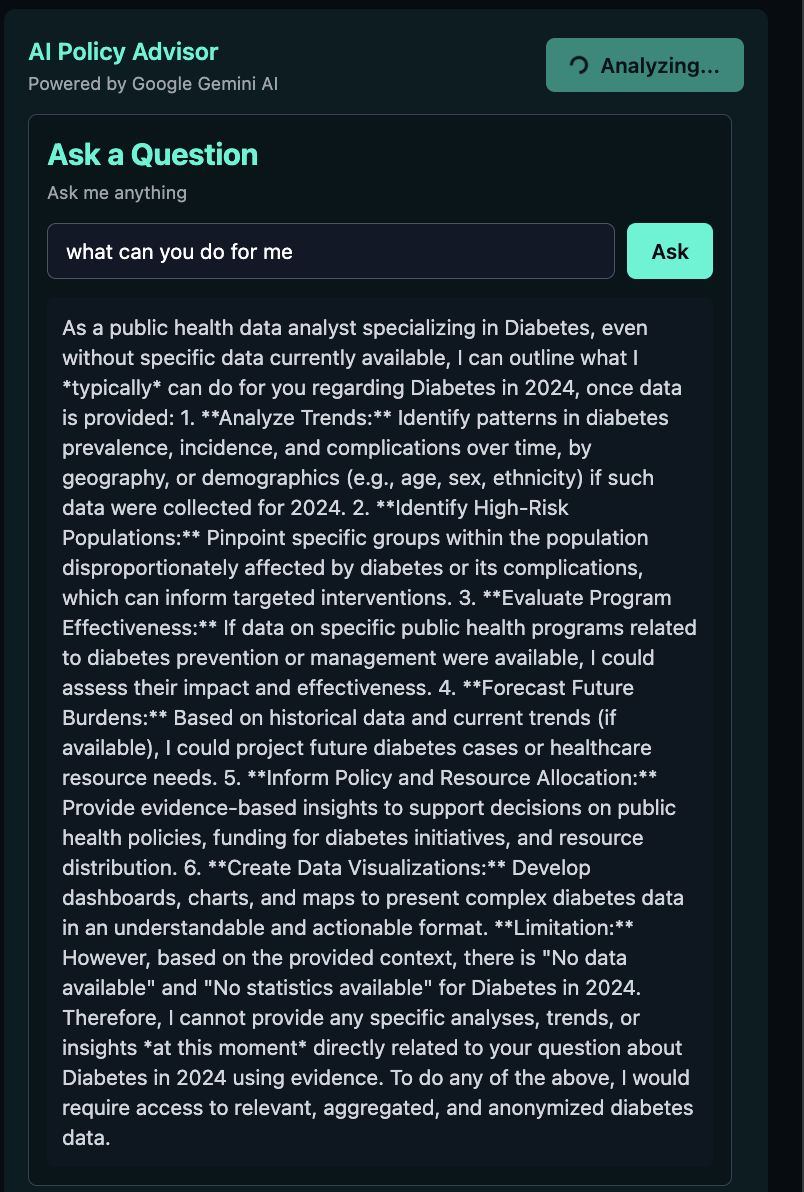 Our roadmap prioritises securing funding for full Gemini API integration, enabling us to automate, explainable AI-driven policy recommendations and collaborative dashboards. Planned improvements include enhanced export capabilities and refined UI/UX to support diverse health equity initiatives in real-world settings.