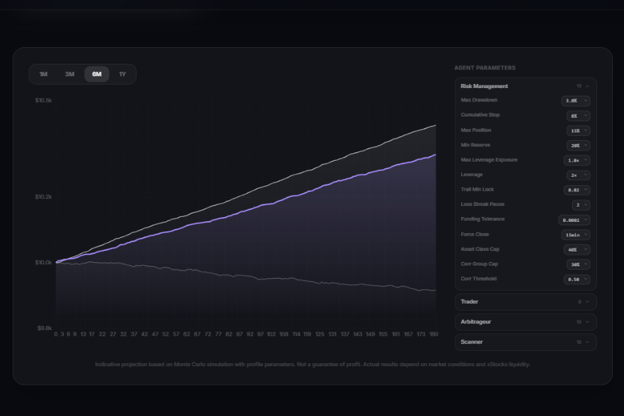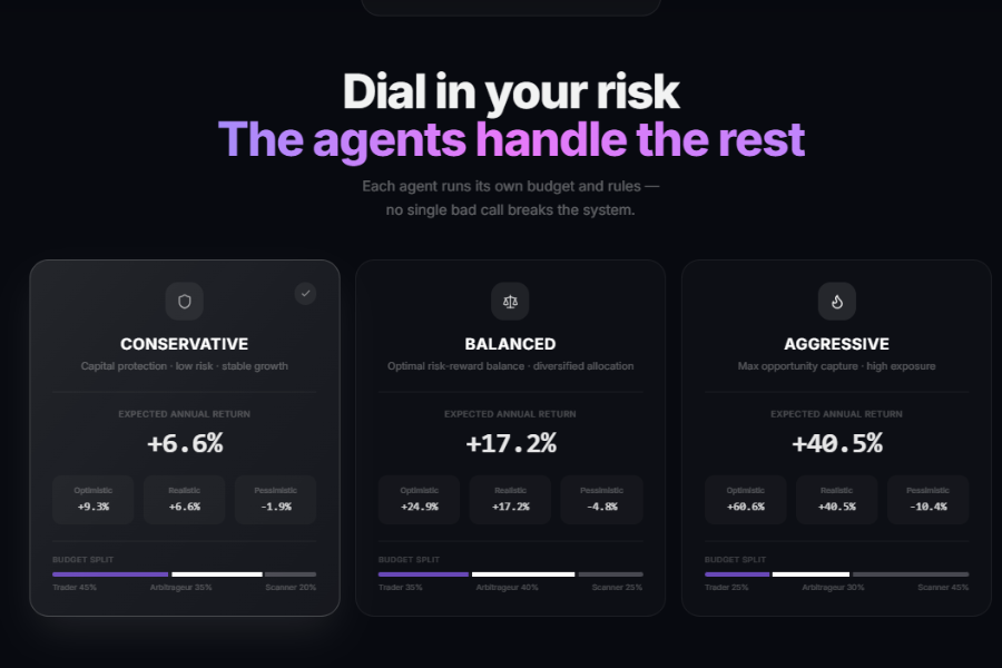 Three risk profiles (Conservative/Balanced/Aggressive) with expected returns of +6.6%/+17.2%/+40.5% and agent budget allocation.