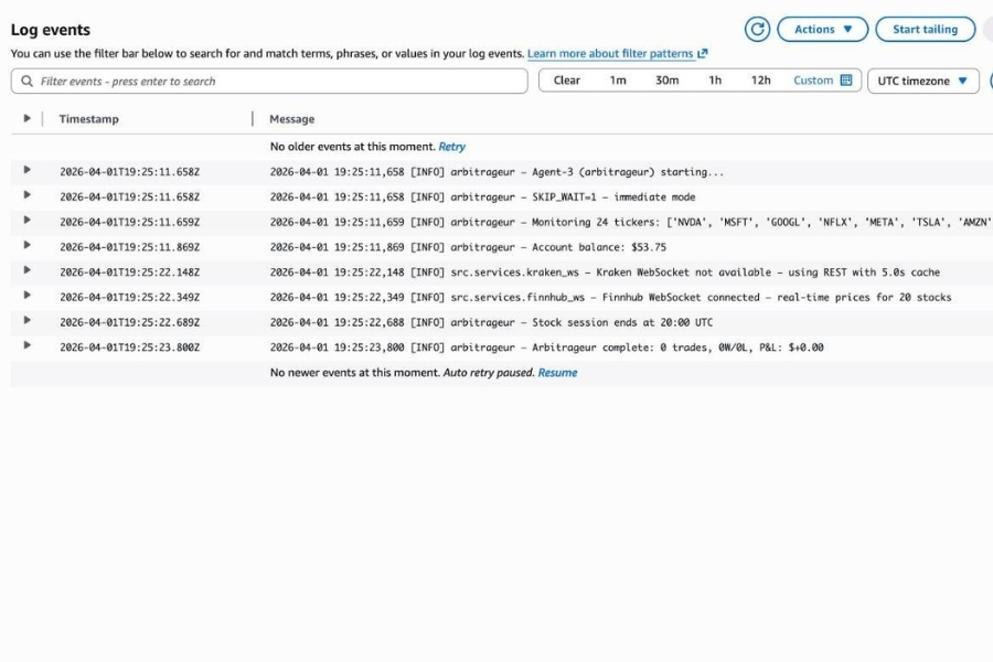 24/7 uptime across asset classes — crypto never sleeps but stocks have holidays. The Analyzer skips sessions on NYSE holidays; the Arbitrageur filters to crypto-only. ECS runs permanently with no scaling gaps.