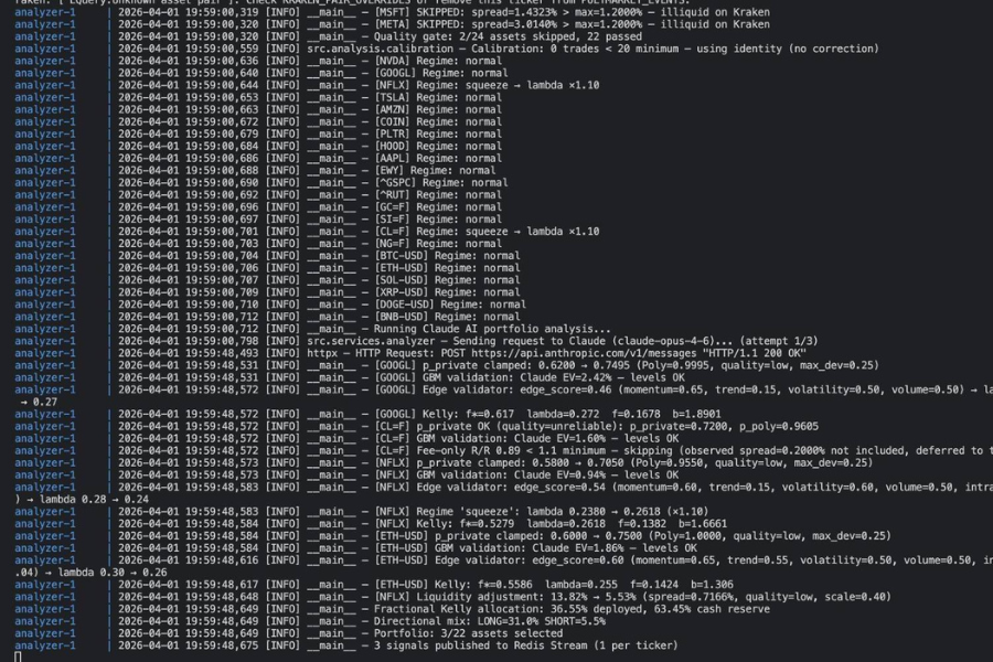 Analyzer screened 22 assets via Claude AI, selected 3 signals (GOOGL, NFLX, ETH-USD) at 36.55% Kelly allocation, published to Redis.