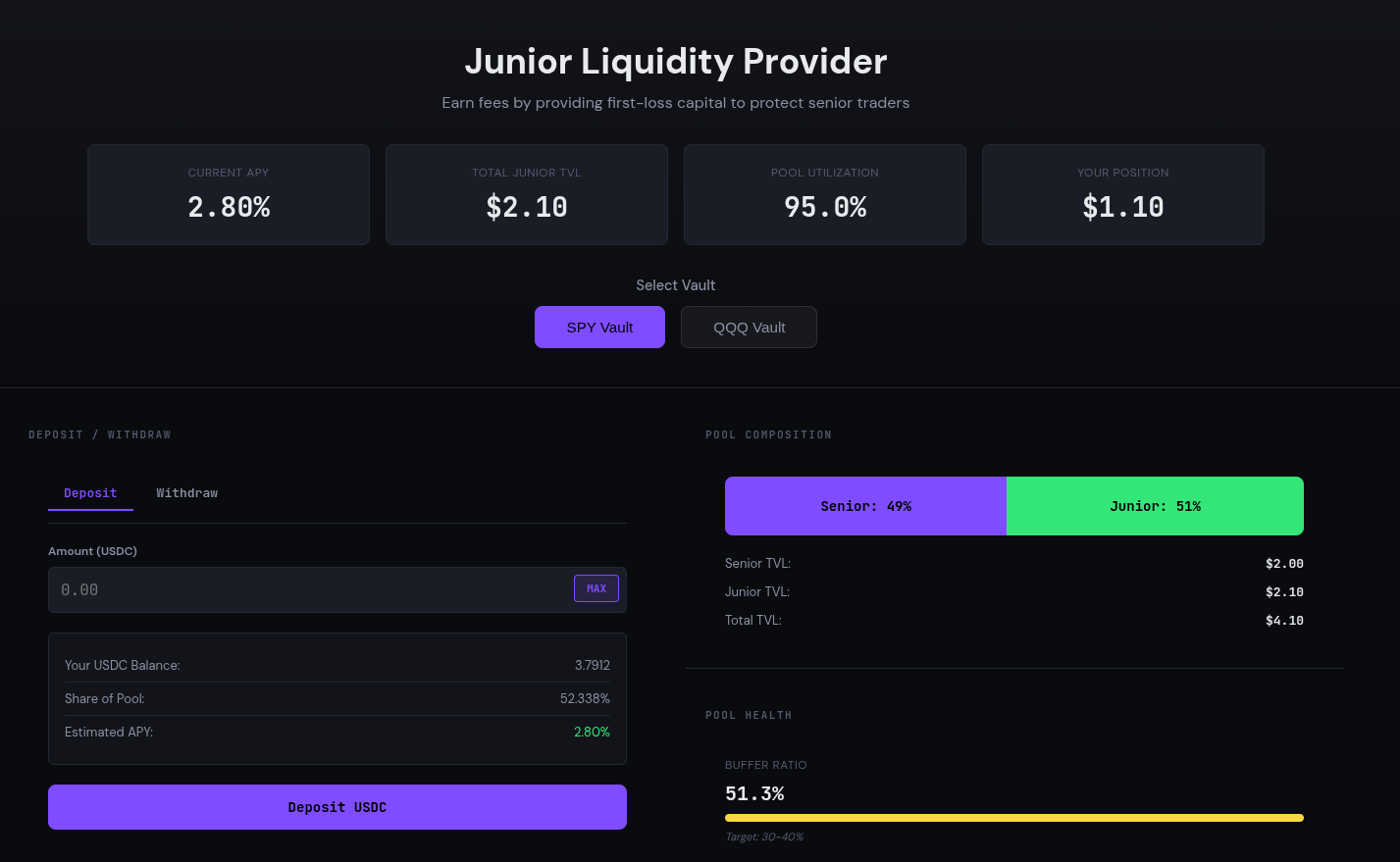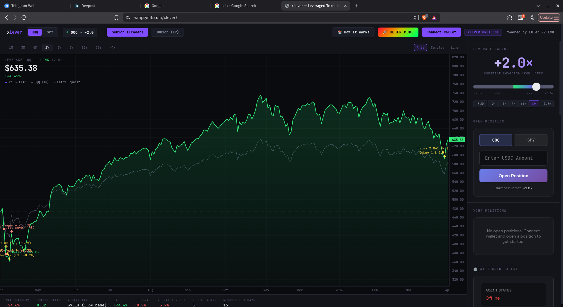 Provides easy to use custom levered exposure to tokenized stocks. Positions can be managed by an AI agent.