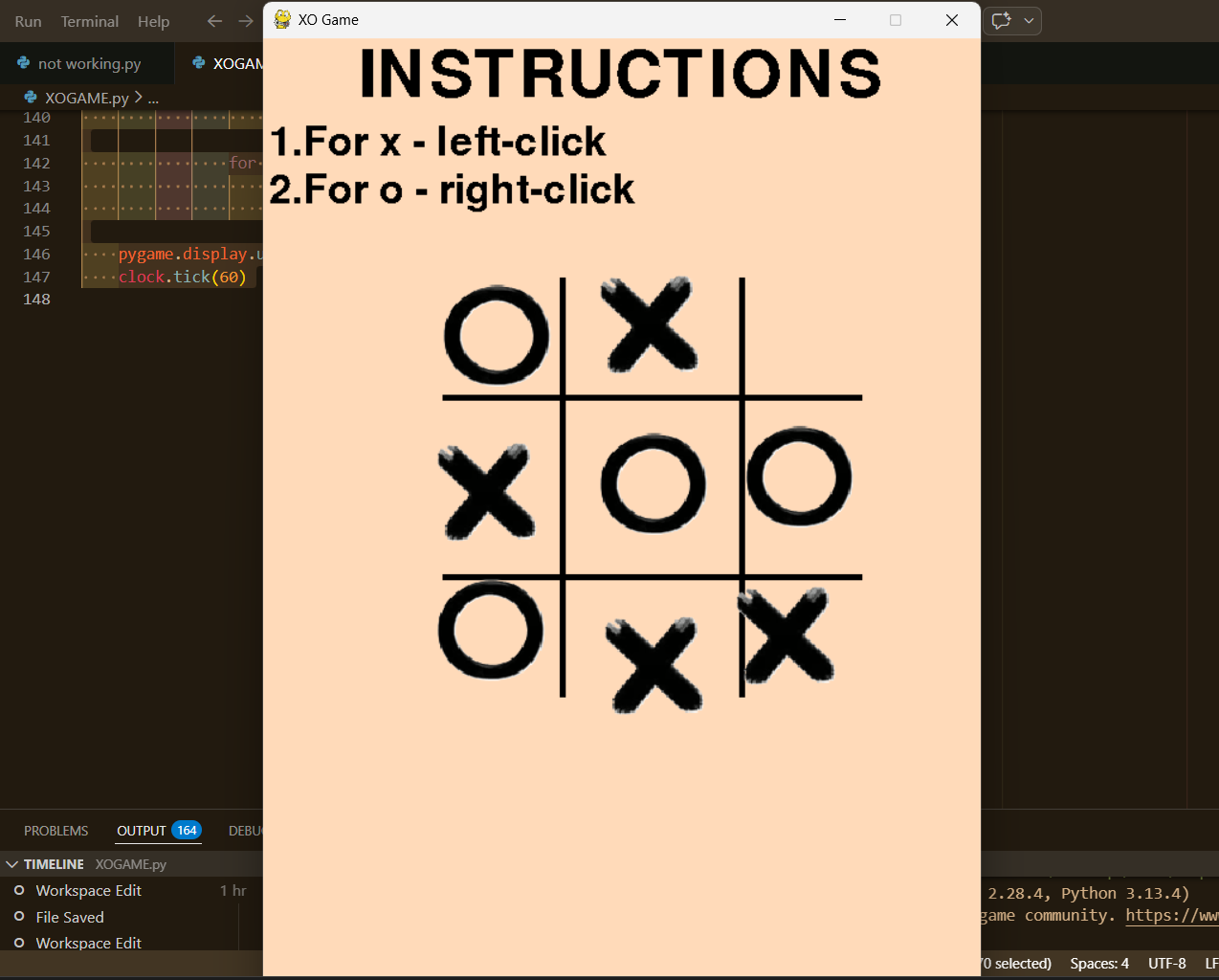 XO Game is a simple tic-tac-toe game built using Python and Pygame. It lets two players place X and O on a board using left and right mouse clicks. The game includes a start screen, a gameplay board, background music, sound effects, and a game-over screen with animations for when all moves are completed.