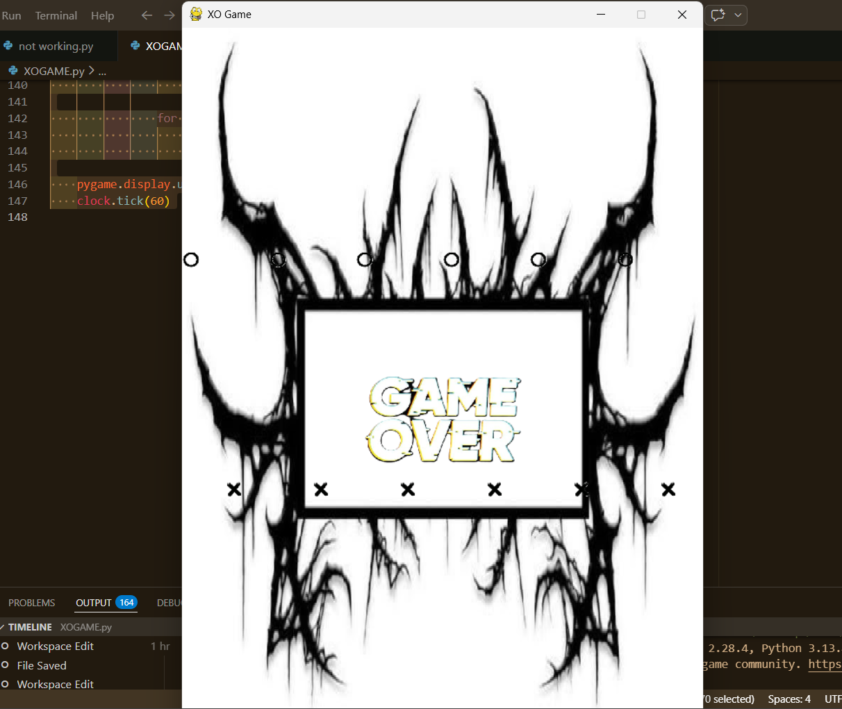 I used Python and Pygame to build the game. The structure is simple: Front page with a start button Gameplay screen where X and O are placed with left/right clicks Game-over screen after all moves