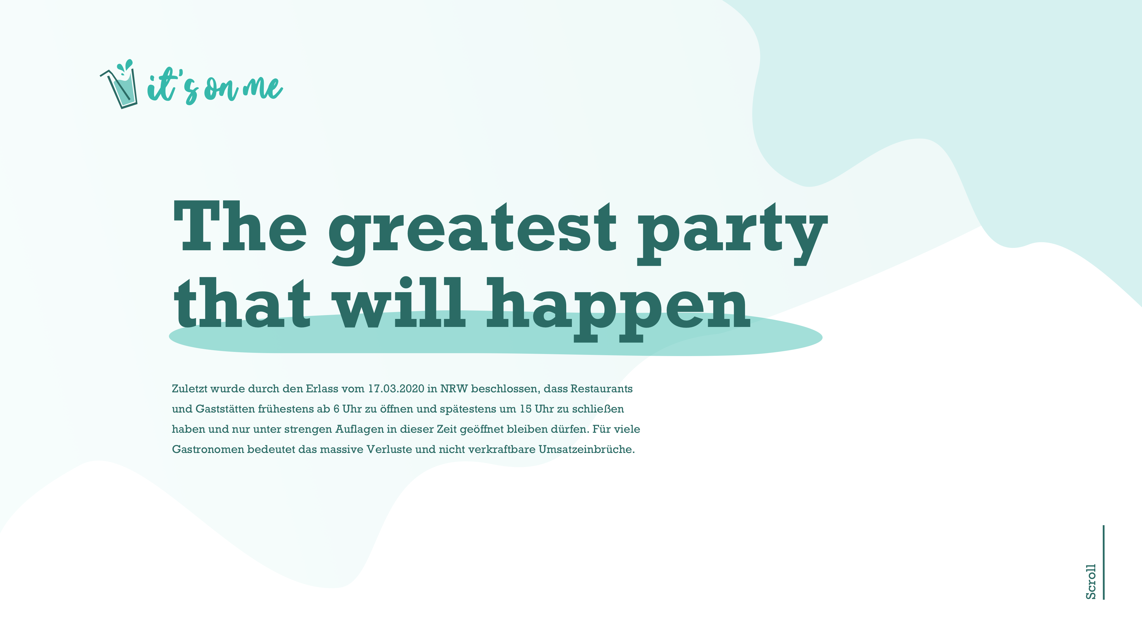 Viele Gastronomen stehen durch die plötzlich ausbleibenden Kunden Ihres Kerngeschäfts vor dem Ruin. Mit "It's on me" wollen wir dem entgegenwirken. In Anlehnung an "That's on the house" wollen wir mit "It's on me" den Spieß umdrehen. Wir wollen eine Plattform schaffen, auf der Gäste ihr Lieblingslokal auf einen Drink einladen. Wir drehen den Spieß also um, anstatt aufs Haus geht der Drink nun auf uns, um unsere lokalen Lieblingsorte zu schützen. Der Gast kann so auch direkt zukünftige Treffen mit seinen Freunden in der Zukunft planen und ihnen virtuelle Getränkegutscheine schicken. Denn Vorfreude ist die schönste Freude!