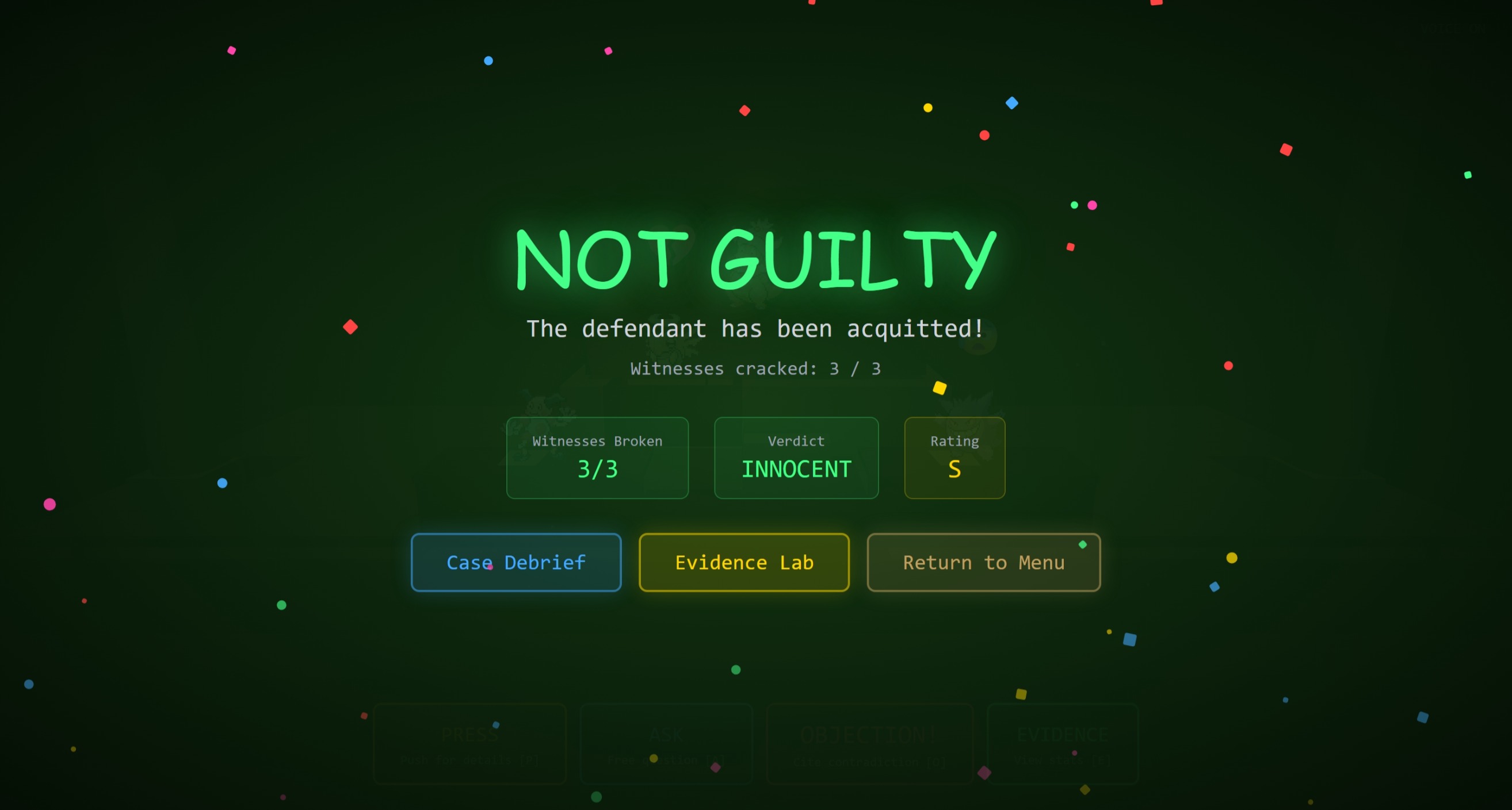 - Press streak system — Press a witness 3 times in a row and they start slipping up, giving you bonus clues