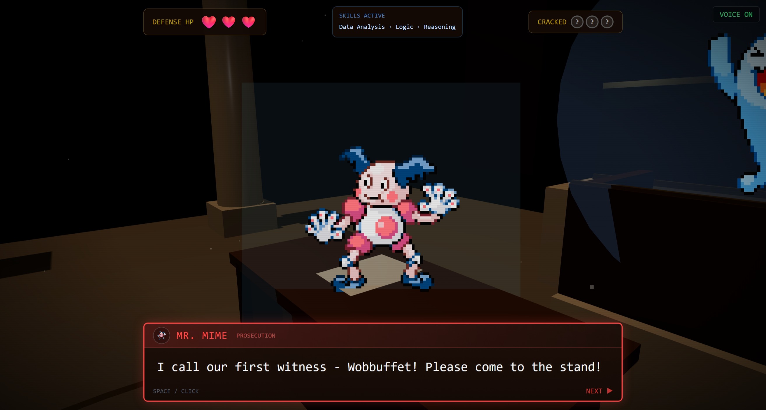 The AI characters have genuine personality. Judge Slowking yawns and hits his gavel. Mr. Mime gestures with invisible objects. Wobbuffet gets progressively sweatier as you press him. These are not canned responses — each conversation plays out differently because Gemini generates dialogue in character based on the game context.