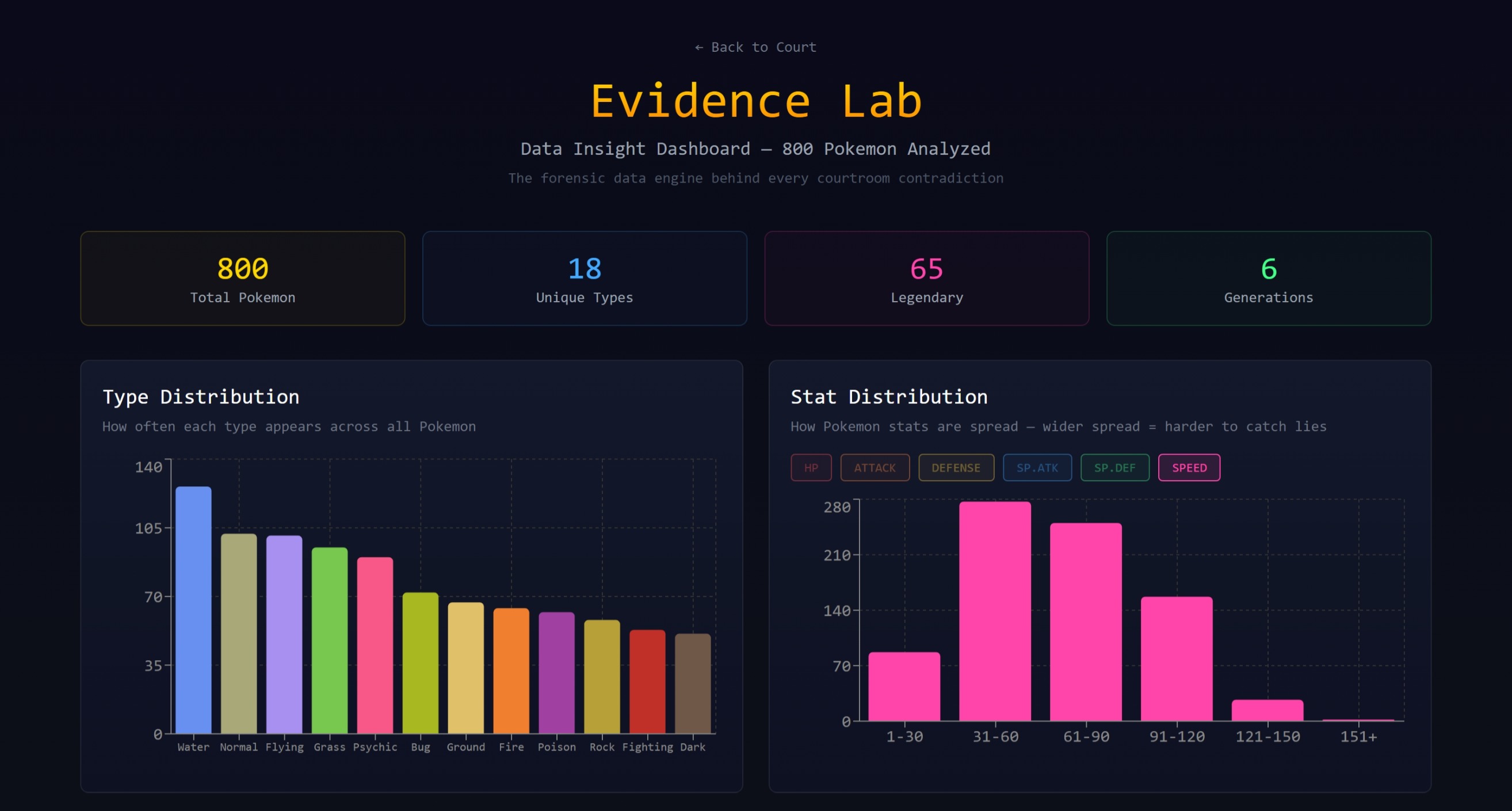 - Different datasets, different games. The courtroom engine is not tied to Pokemon. Swap in a sports stats dataset, financial data, or historical records and you get entirely different trials. The core mechanic — compare claims against real data — works everywhere.