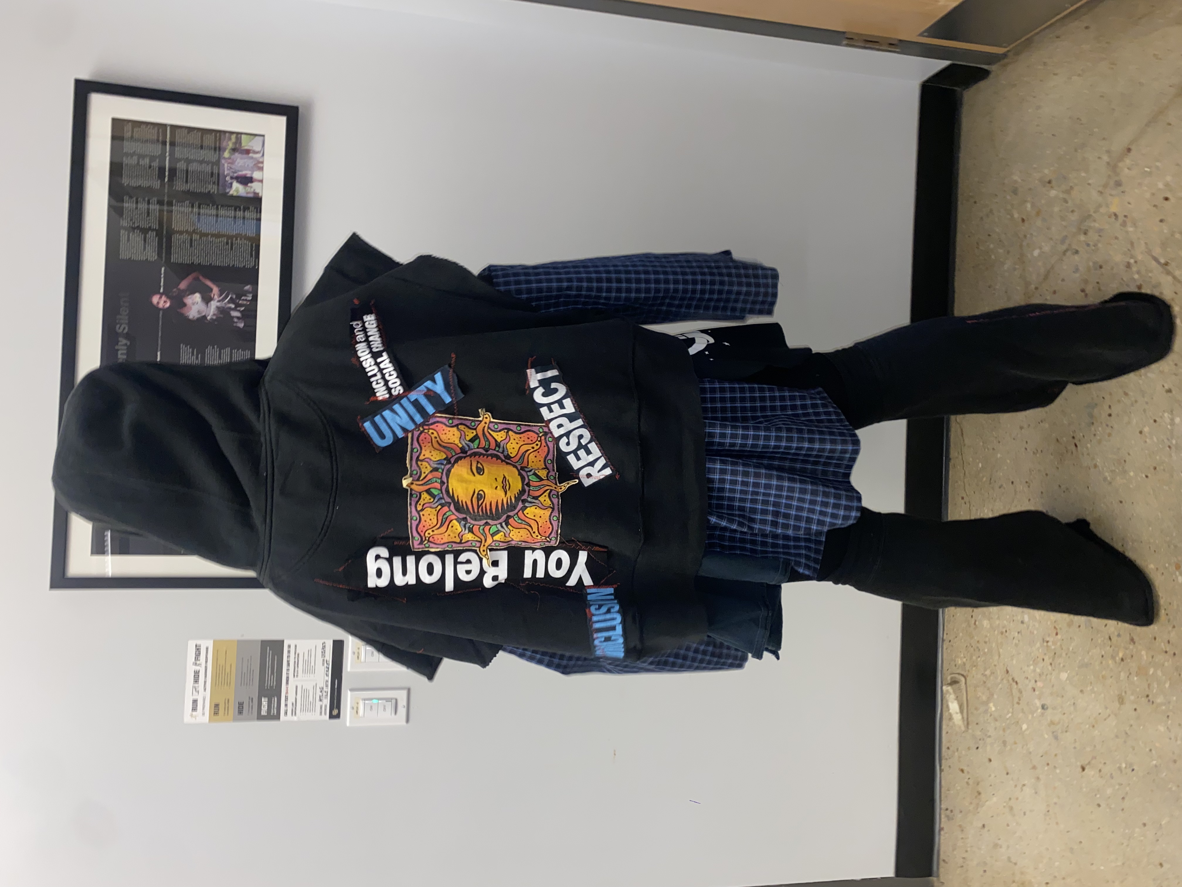 In the year 2222, common resources used today to produce clothing materials like cotton, leather, and wool will be fully depleted due to water scarcity. We believe that in the year 2222, today’s mistakes of overconsumption and fast fashion will lead to an overabundance of discarded fabrics, and the style of recycled fashion will not only be popular, but a necessity. Our outfit is a futuristic take on modern day streetwear, The back of our outer layer exhibits motivating and powerful words to highlight the hypocrisy of large enterprises promoting human unity in a universe where social classes are worlds apart. The irony of the entire outfit lies in the fact that these words lose their meaning when the world has reached a point of doom. In the year 2222, commercialization will be at its peak, and leading corporations will capitalize off of marketing recycled clothing as “trendy” and “desirable,” when in reality, they simply have exhausted their resources for fresh clothing material. Our piece resembles what such corporations would advertise as “the peak of fashion” in the year y22k.