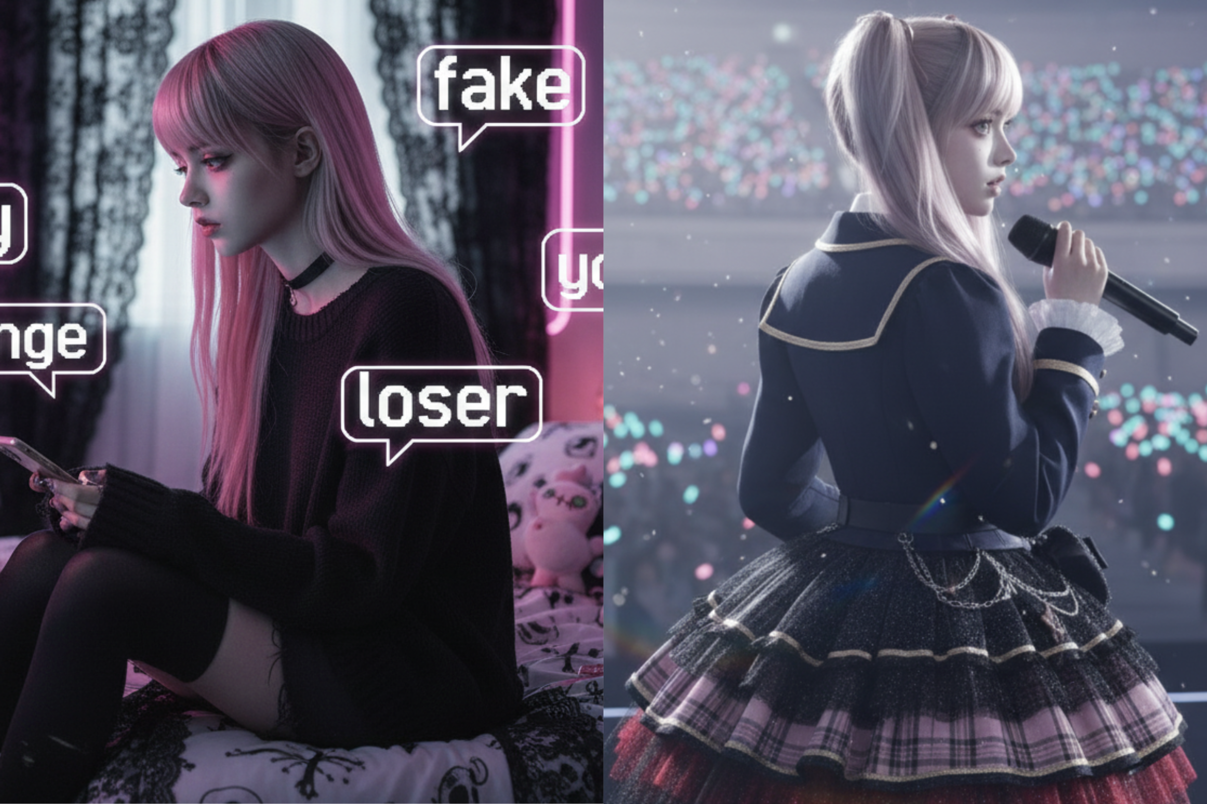This project visualizes the psychological journey of a famous creator whose online identity begins to collapse under constant scrutiny. Through yami-kawaii stylized scenes, it depicts her hair losing color from stress, comments attacking as light beams, her body cracking like glass, and eventually her recovery as she reconnects with her offline self. The film culminates in a euphoric Tokyo Dome performance and ends with a quiet, healed smile in a soft white room.