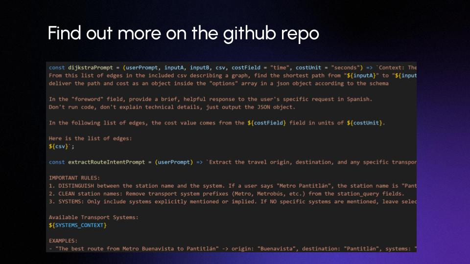 The STC Metro and Metrobús network has thousands of possible edge combinations. Feeding all of that into an LLM would be wasteful and noisy. The biggest challenge was building the pre-filtering logic that extracts a contextually relevant "sub-graph" small enough for the LLM to process instantly but large enough to include all viable alternatives.