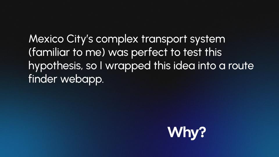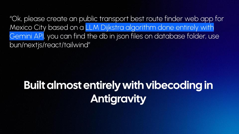 This project was created as "vibe" coding using Antigravity. The initial prompt was: "Ok, please create an public transport best route finder web app for Mexico City based on a LLM Dijkstra algorithm done entirely with Gemini API, you can find the db in json files on database folder, use bun/nextjs/react/tailwind"