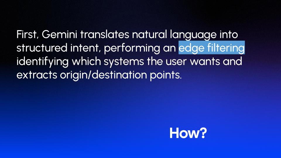 - Intent Translation: Gemini translates natural language into structured intent, performing "Edge Filtering." It identifies which systems the user wants and extracts origin/destination points.