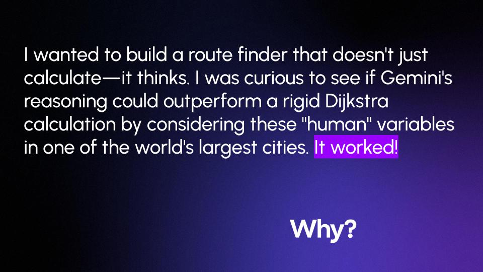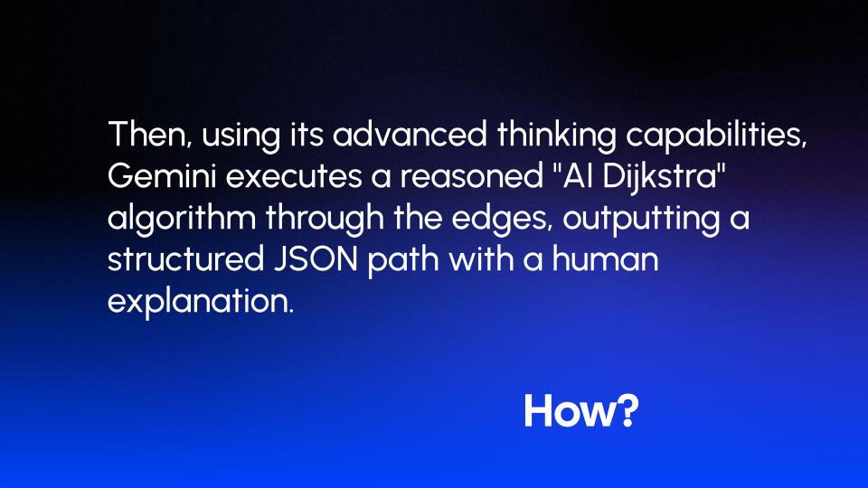 - LLM Dijkstra Step: This is the revolutionary part. Instead of running a code-based search, we feed the filtered transit graph directly into Gemini's long context window. Using its advanced thinking capabilities, Gemini executes a reasoned "AI Dijkstra" search through the edges, outputting a structured JSON path with a human explanation ("foreword").