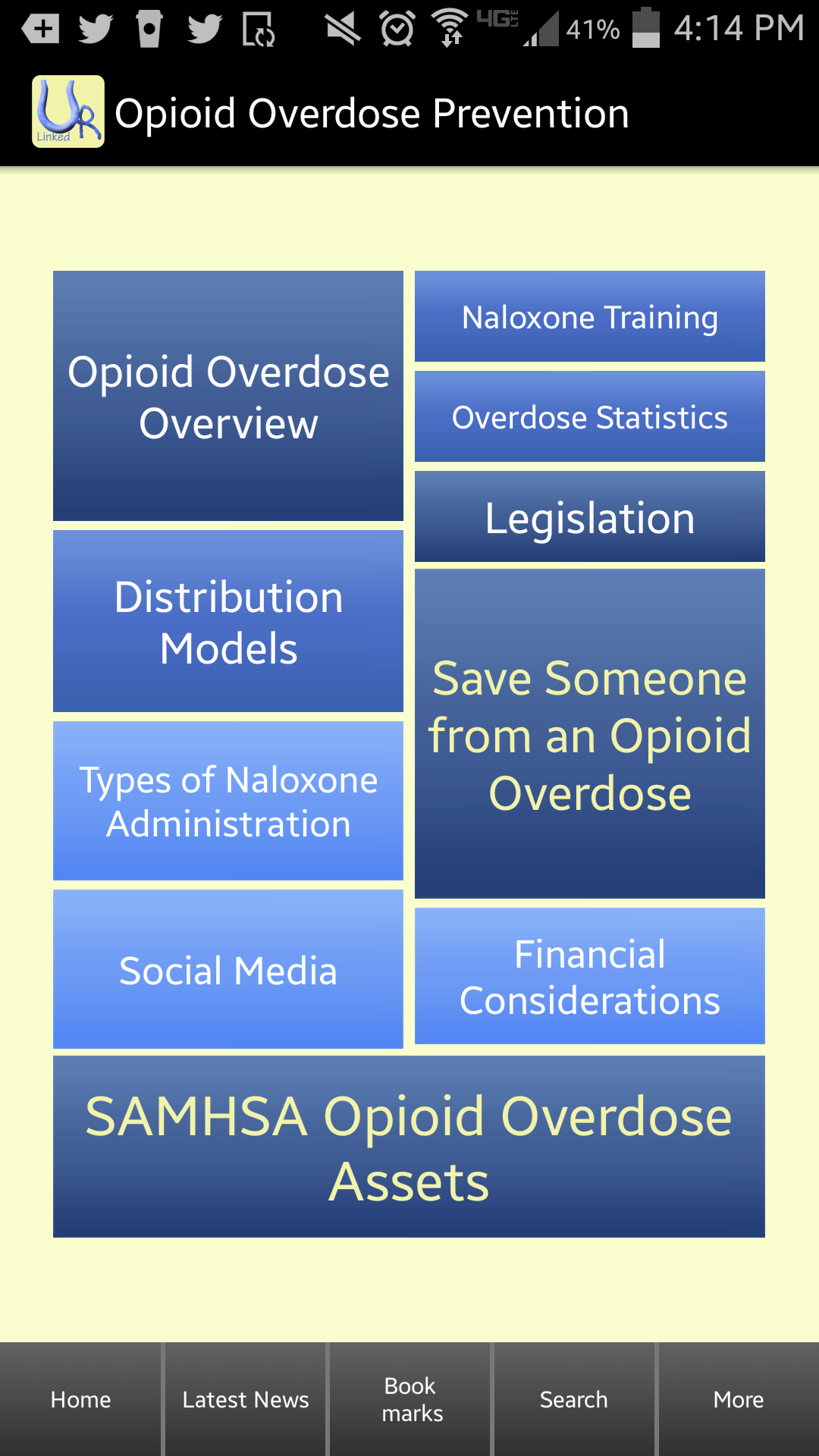 The You Are Linked to Resources "Opioid Overdose Prevention” app was created for the friends and family of those with substance use disorder as well as those living with substance use disorder. The app is designed so that those seeking information on the life-saving drug Naloxone (or Narcan) can find reliable and safe information in an efficient and organized way. The full version contains around 2,000 links organized into 10 main categories, 30+ subcategories, and 175+ sections in order to make navigation easy and efficient. The main categories include: Save Someone, Distribution Models, Opioid Overdose Overview, Legislation, Overdose Statistics, Naloxone Training, Types of Naloxone, Financial Considerations, Social Media and SAMHSA Opioid Overdose Assets. There is a flowchart containing all of the content incorporated into the menu button in order to help users navigate the app more easily. “Opioid Overdose Prevention” is updated daily with information from the news, professional magazines, and over 600 websites which makes it a useful tool for professionals in the recovery community and physicians who are trying to stay up to date on this material.