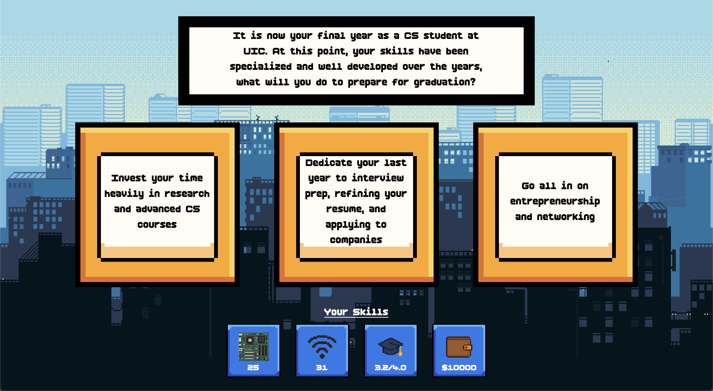 Our game follows the journey of a UIC computer science student through their 4-year undergraduate study. Players are presented with different scenarios and checkpoints throughout the game, where they can make different choices to affect different skills. At the end of the game, users choose what they want to do upon graduation, and their skills gained over their time at UIC determines their success within their choice. The game is essentially a data-driven narrative.