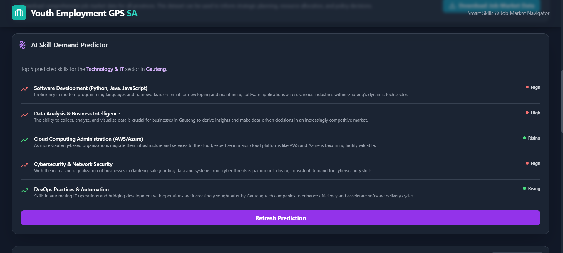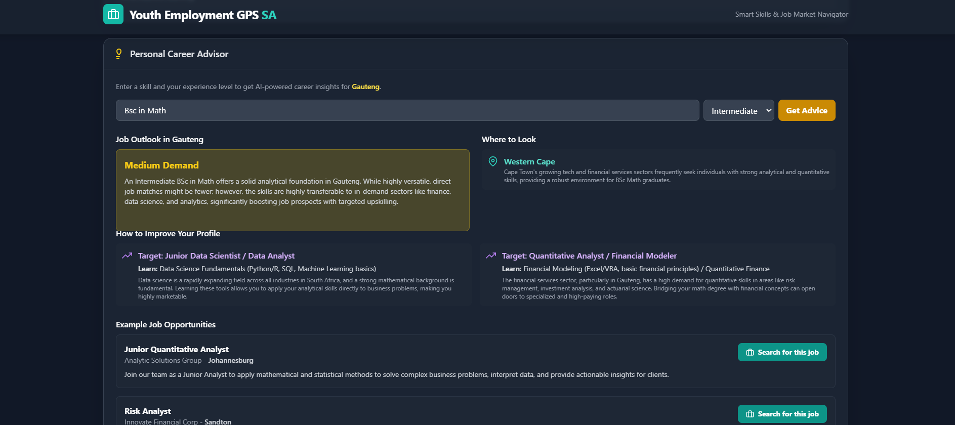 Africa is the youngest continent in the world, with over 60% of the population under the age of 25. We are rich in talent, culture, and potential, but we’re facing a crisis of opportunity. South Africa has one of the highest youth unemployment rates in the world with over 45% of young people (aged 15–34) unable to find work.It’s a painful reality I know firsthand. Like many South Africans, I grew up in a system where information was scarce, guidance was limited, and opportunity felt random. I didn’t know which skills were worth learning. I didn’t trust half the training programs I came across. And there was no real-time, local data to help me make smart decisions about my future. Eventually, through self-research, frustration, and trial-and-error, I found my way into tech. But that experience showed me one thing clearly: “The system doesn’t lack talent, it lacks tools.” Youth Employment GPS was born from that truth.