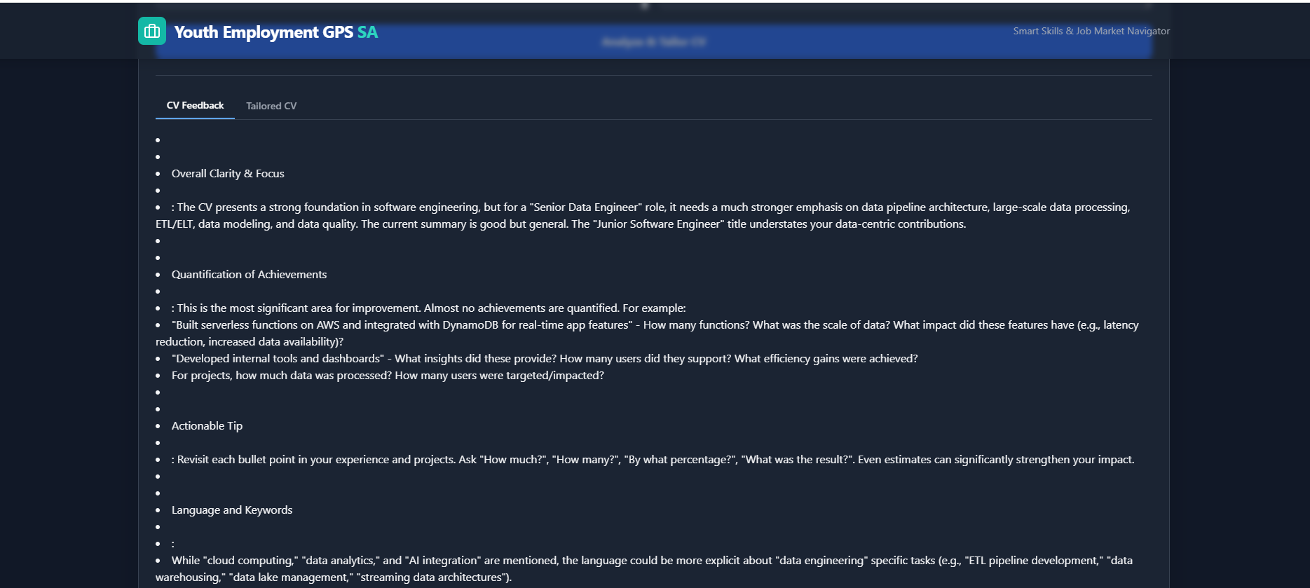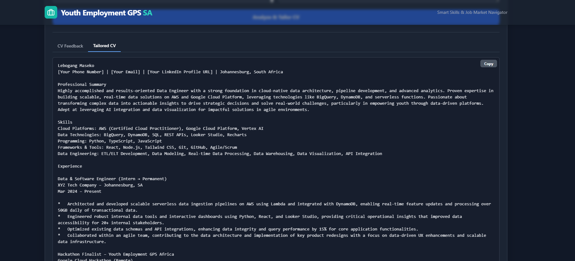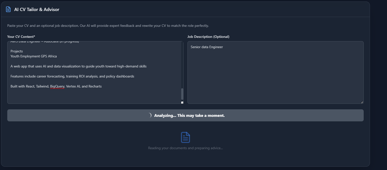 Built a fully working, cloud-native AI platform in a short timr period. Designed a product with South African youth in mind, but scalable across Africa Created something visually beautiful, socially impactful, and technically sound Proved that data can do more than describe, it can direct, empower, and transform