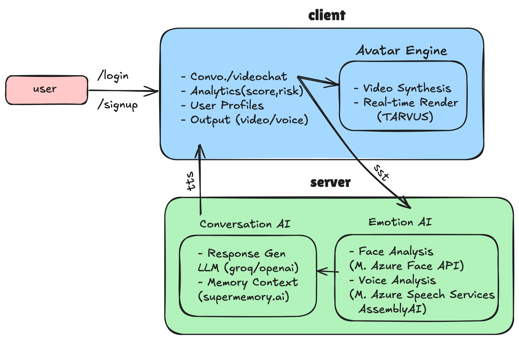 - Avatar / Video: WebRTC + WebGL / three.js, Tavus API (prototype)