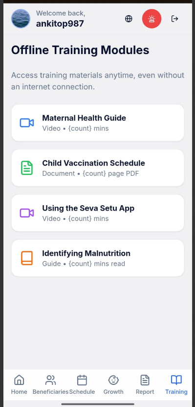 Role-Based Dashboards: Provides ASHA workers, PHC staff, and supervisors with personalized views of data and tasks relevant to their roles in an easy-to-use manner.