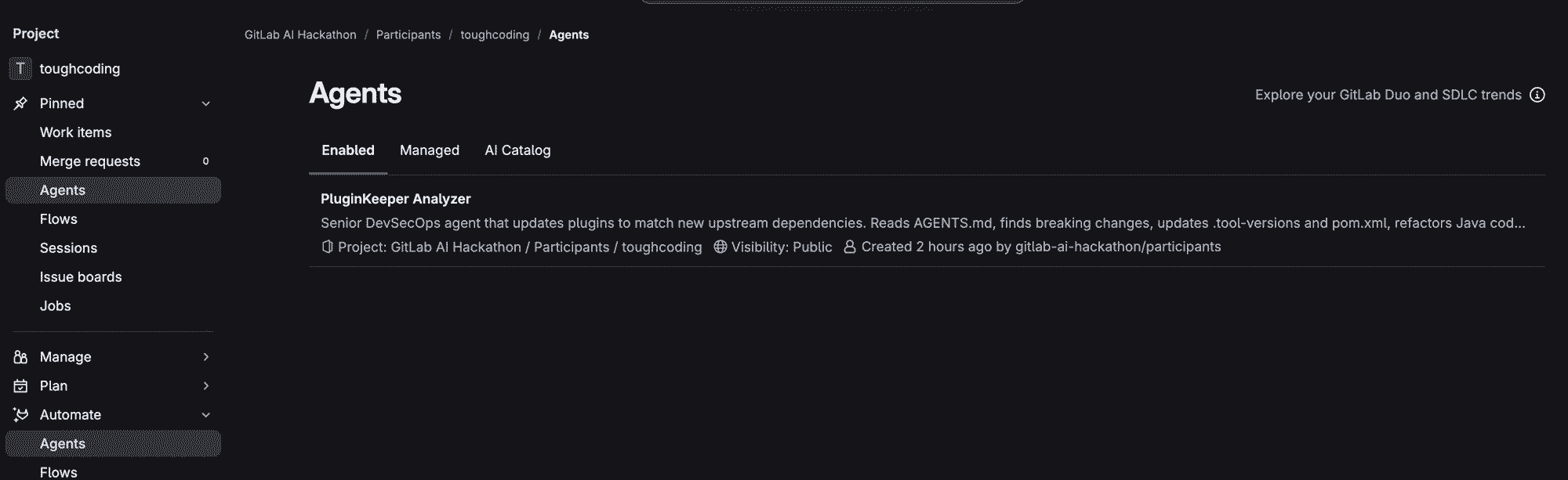 We learned how to orchestrate multi-step AI workflows using the new GitLab Duo Flow YAML schema. We also discovered that providing highly structured context (like an AGENTS.md file) drastically improves the agent's ability to navigate a repository and write accurate, compilable Java code.