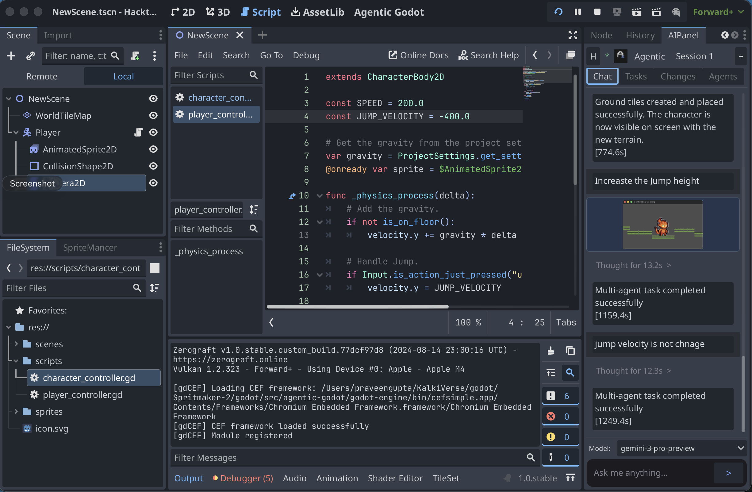 ZeroGraft lets you describe your game in plain English. Gemini 3 builds it — generating pixel art, writing GDScript, configuring physics, and assembling playable scenes in real-time inside the editor.