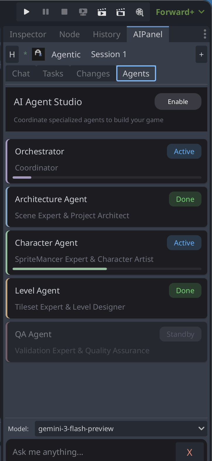 Multi-agent orchestrator — Architecture, Character, Level, and QA agents coordinate complex builds. 50+ step game creation with loop detection and error recovery.