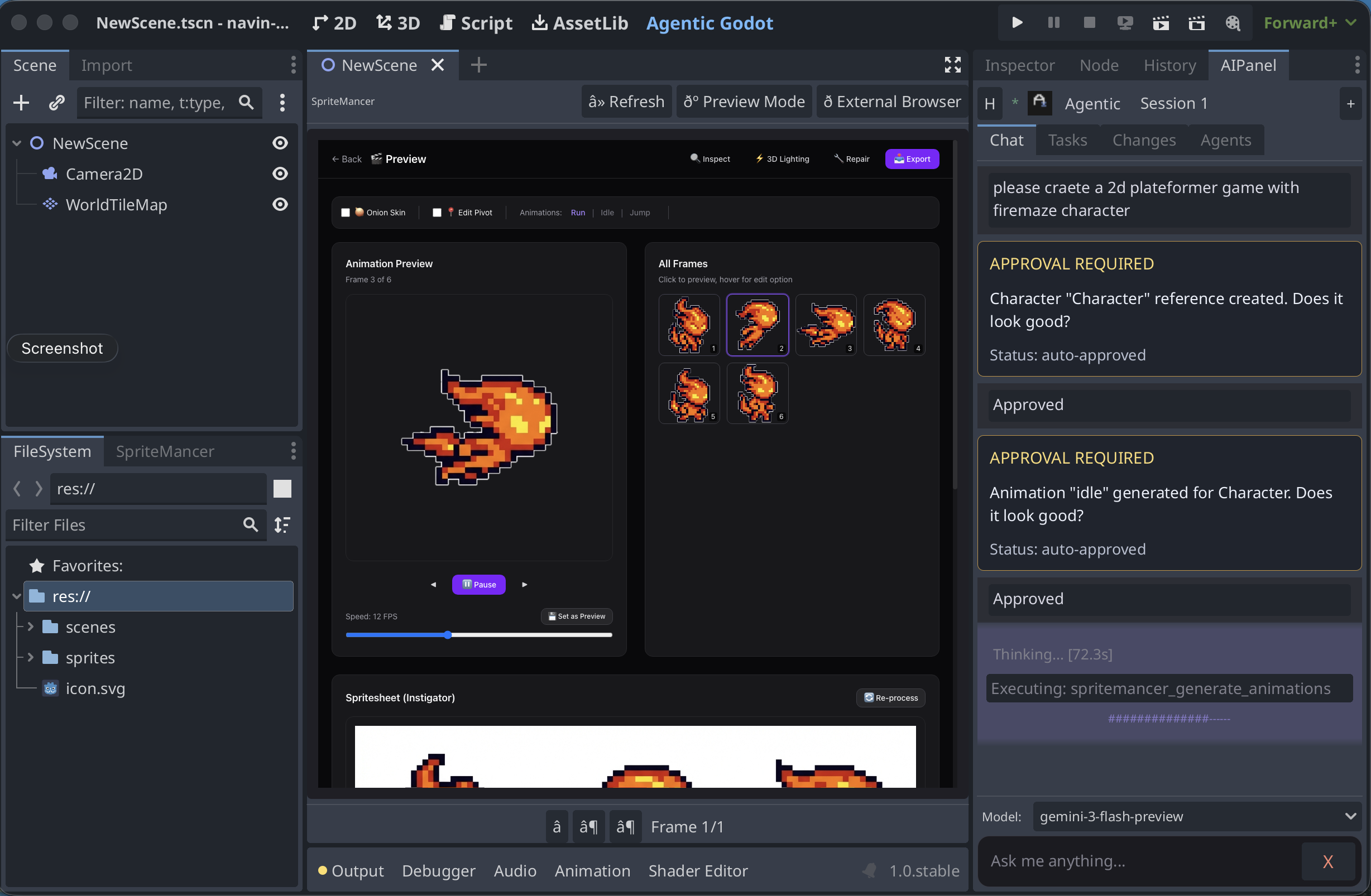 The result: A single person can type "Build me a platformer with a knight who double-jumps" and get a playable game with AI-generated pixel art, GDScript, physics, and a complete scene tree — all inside the Godot editor.