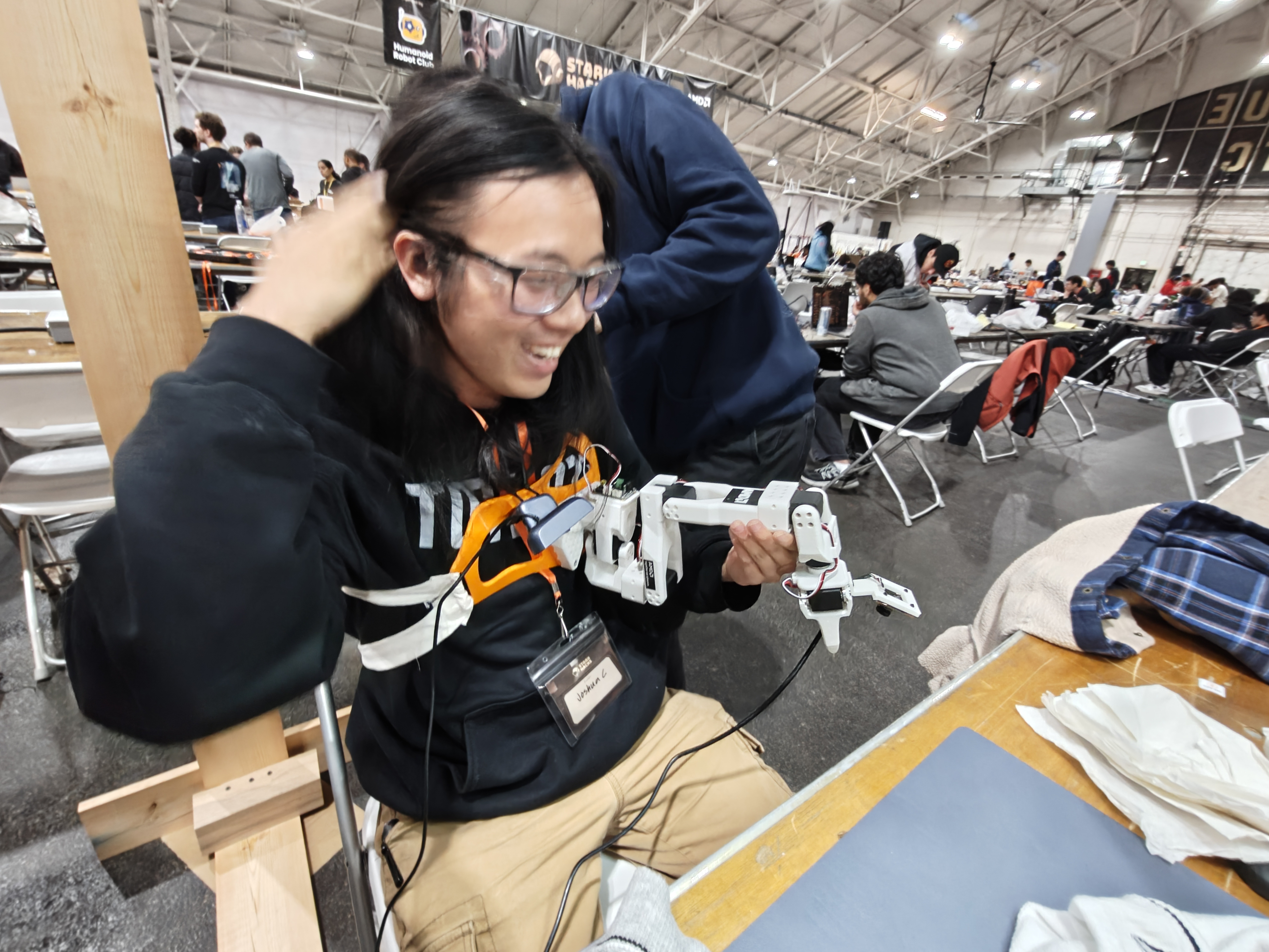 We built a wearable robotic limb mounted on the chest that adds an extra arm to the body. It is controlled through voice commands and powered by a vision-language-action model, allowing it to understand intent and act in real time helping you hold, assist, and accomplish more tasks simultaneously.