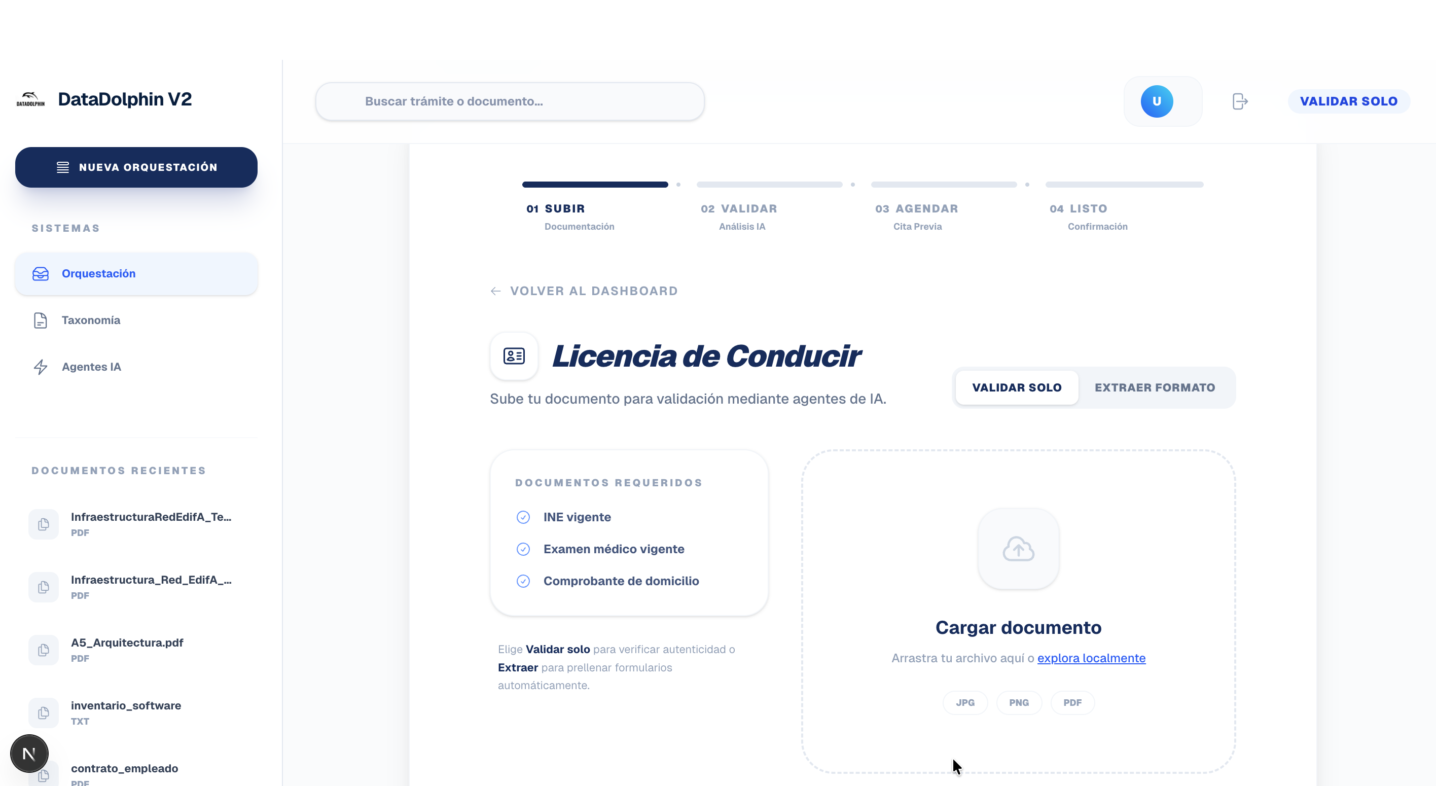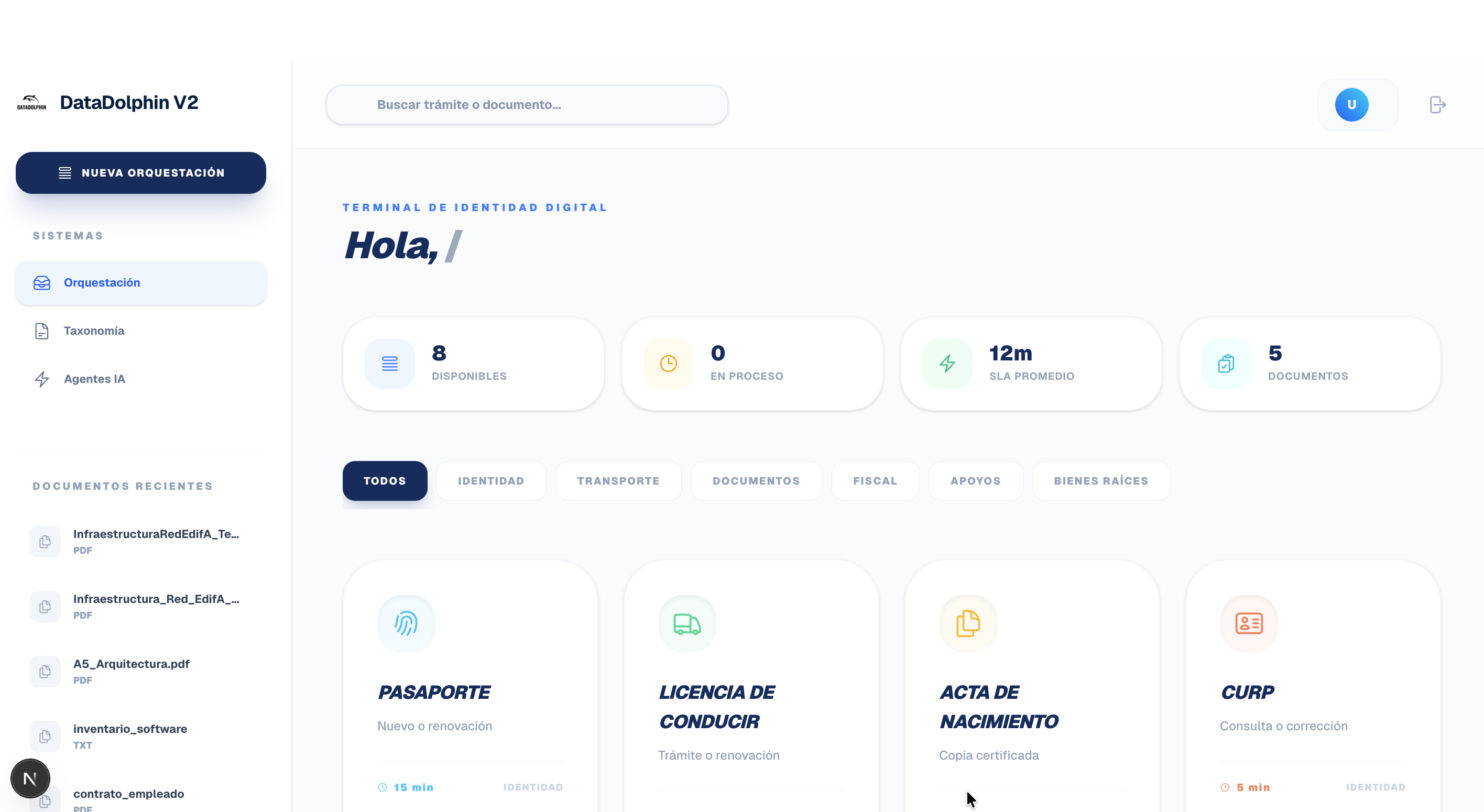 DataDolphin V2 es una plataforma avanzada de orquestación y clasificación semántica que utiliza IA multimodal para automatizar trámites de nivel gubernamental y privado.