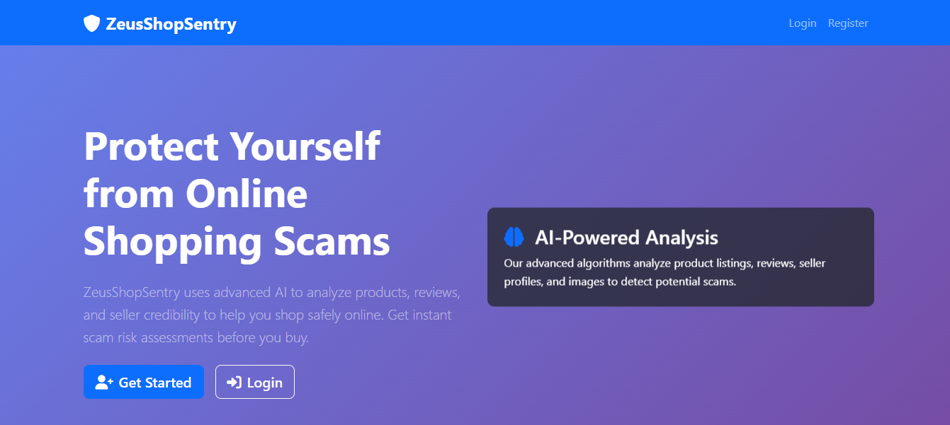 ZeusShopSentry is a web application that scans product links from online marketplaces like Alibaba and Amazon or any online shopping platform of their choice to determine their credibility. Once a user pastes a link, the app generates an AI-powered Trust Report that includes a scam probability score, seller background insights, product authenticity analysis, pricing red flags, and an overall verdict Safe, Caution, or Avoid. It uses natural language processing to evaluate the listing's text, seller details, and metadata, making it easy for anyone to assess the safety of an online deal in seconds.