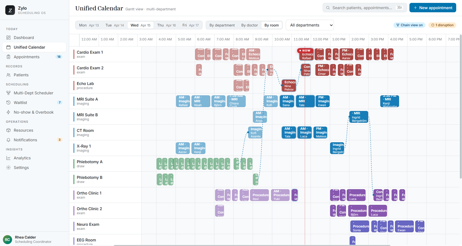 - Builds optimized schedules across multiple departments in one flow (e.g., lab -> imaging -> specialist)